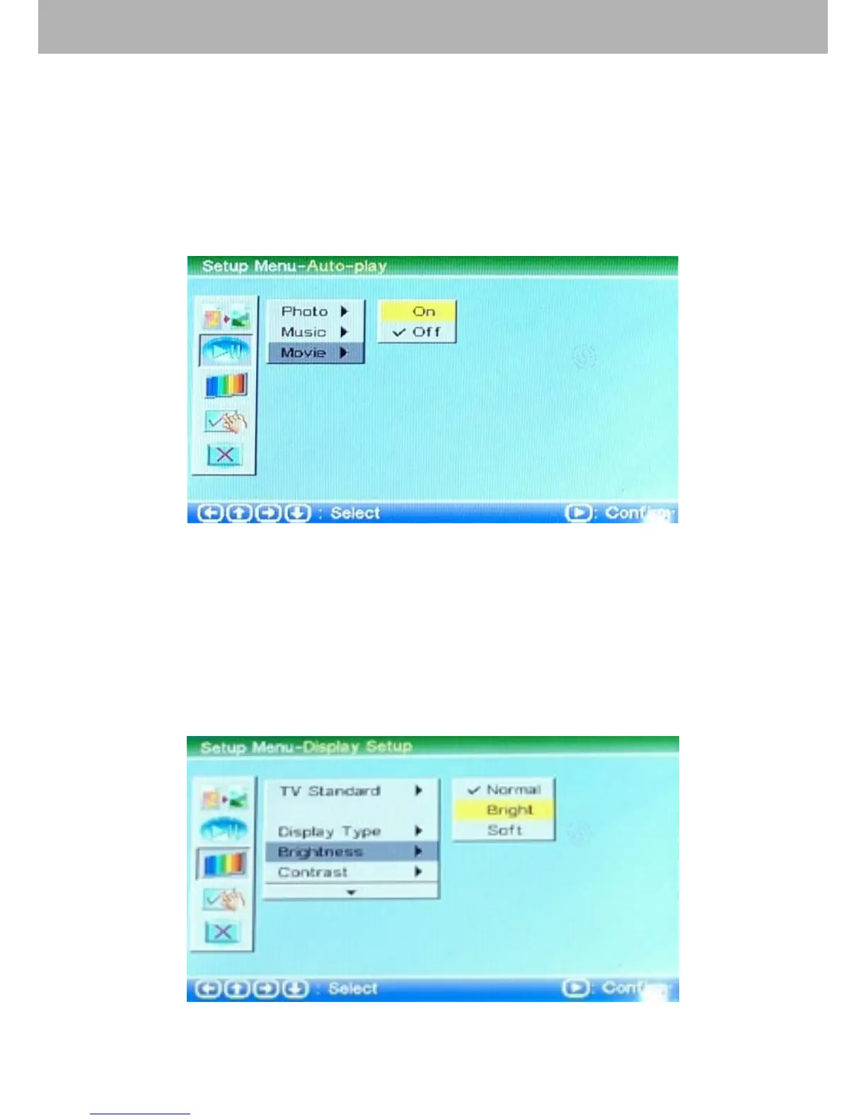 Choose “Brightness” by the cursor to adjust the brightness of
