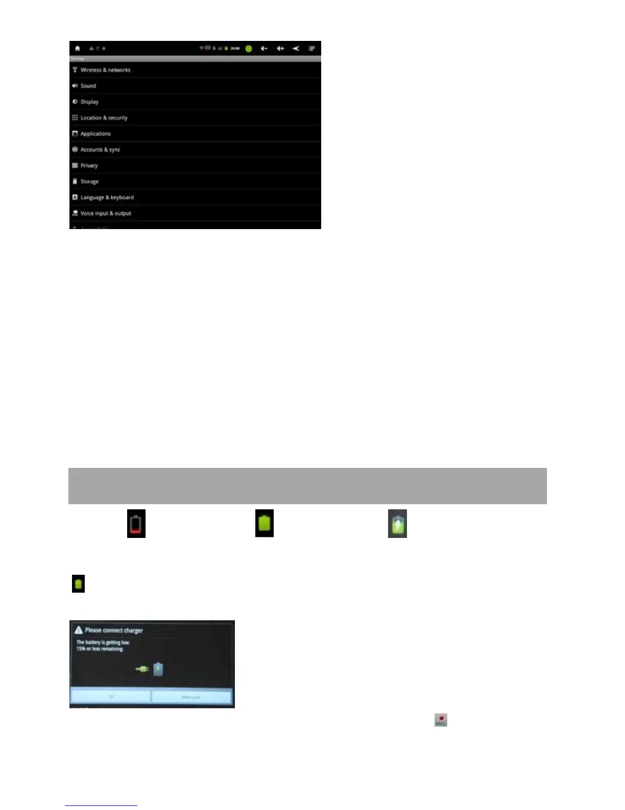’ indicates that the power of Battery is full. When the battery level becomes too low, a prompt comes up to