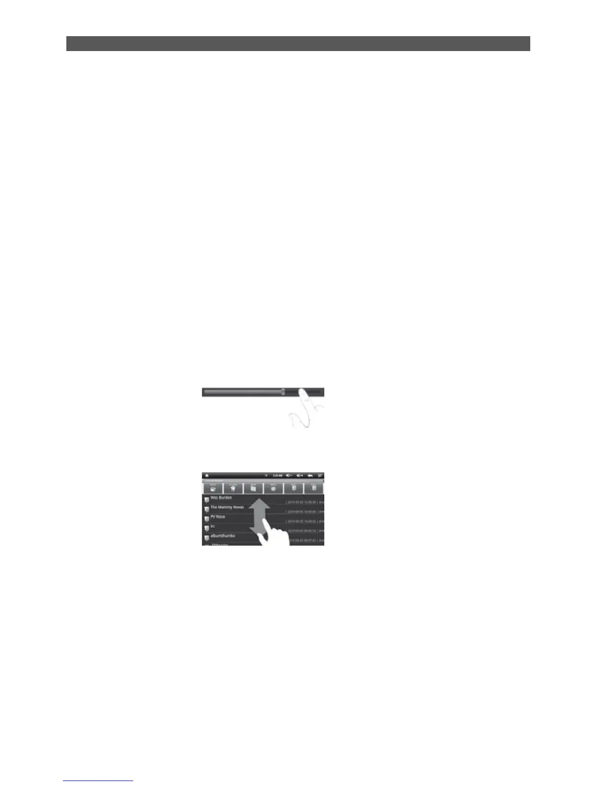 • Nell'esplorazione delle cartelle (File, Musica, Video, Photo, ecc...), potete trascinare il dito dal basso