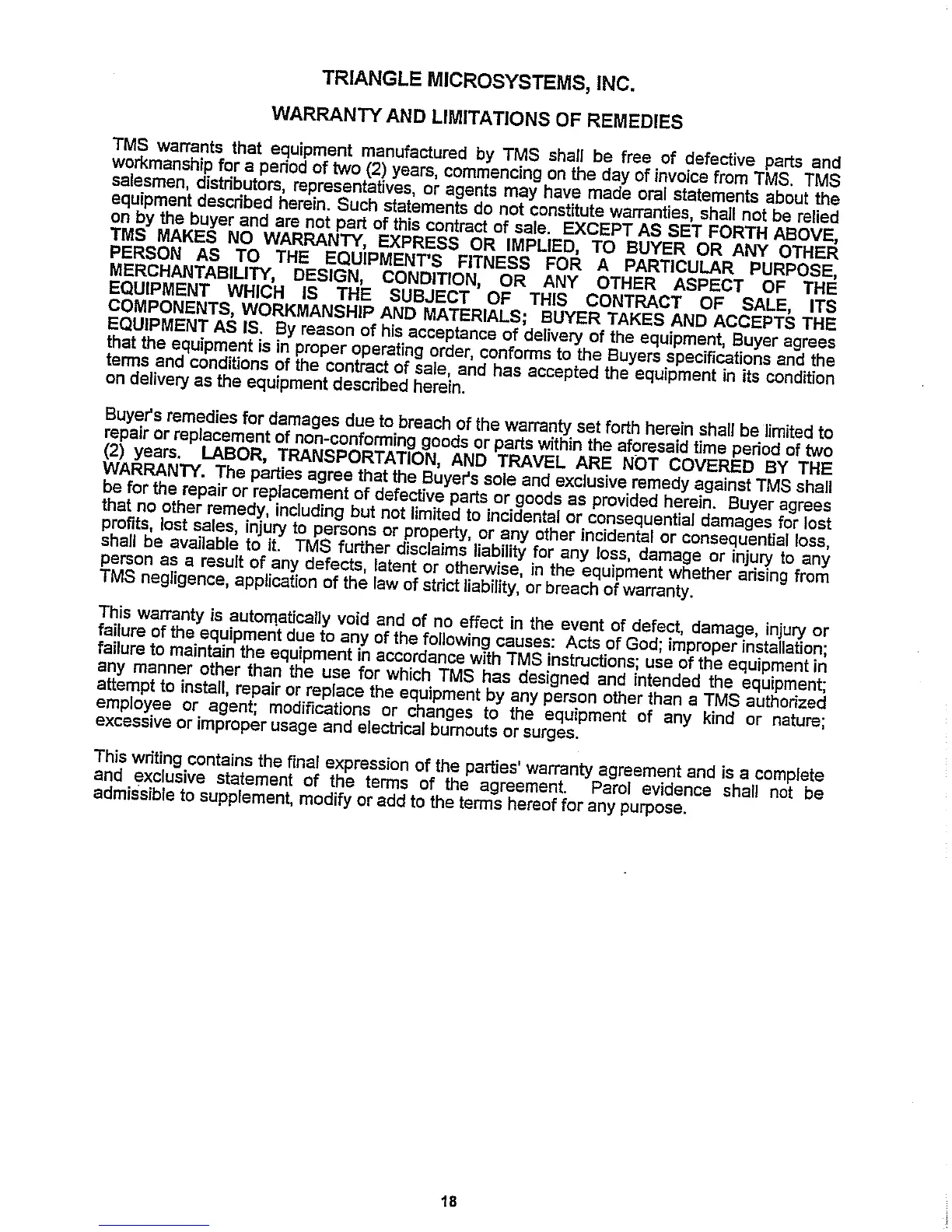 Triangle MicroSystems TMS - 800F - Warranty and Limitations of Remedies