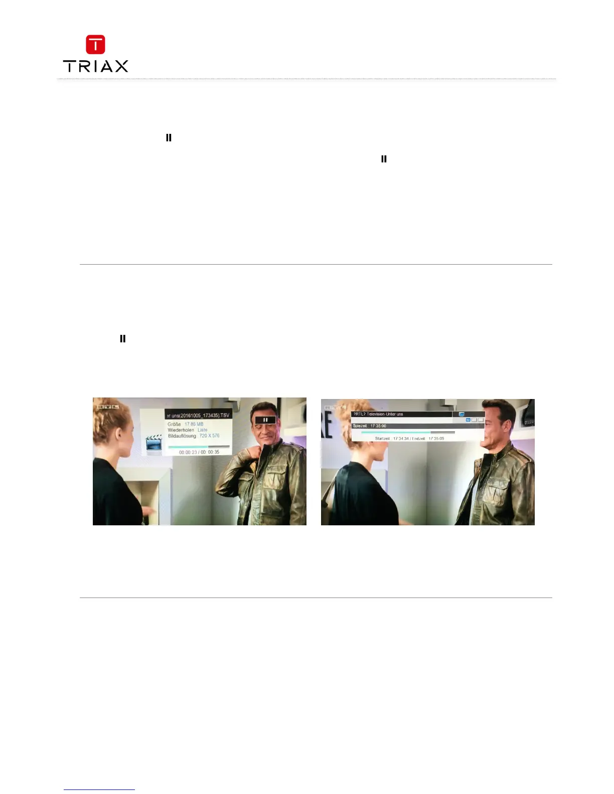 PAUSE Taste . Der Receiver nimmt das Programm auf das USB-Speichermedium vorrübergehend auf. Das angezeigte Bild wird