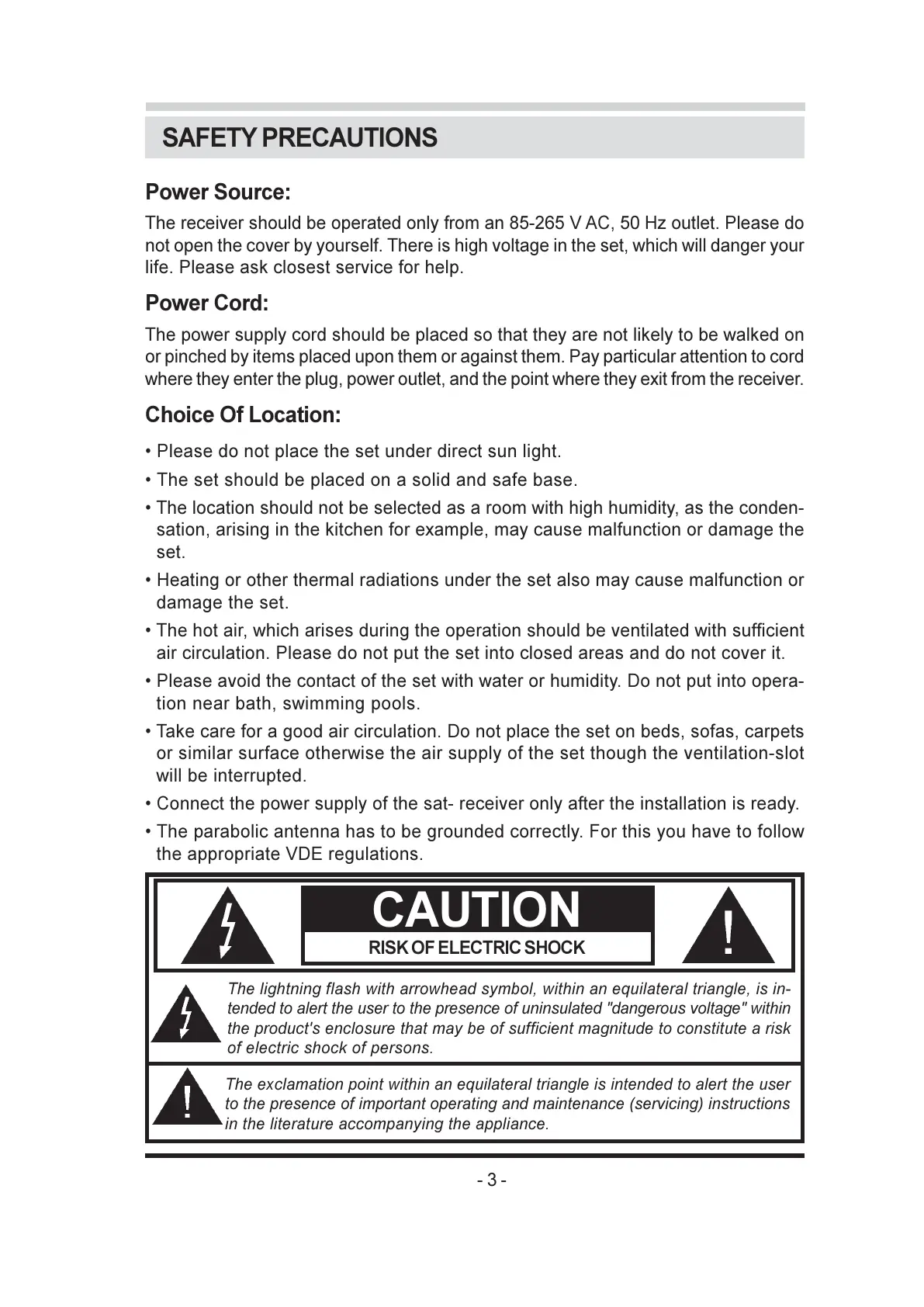 The receiver should be operated only from an 85-265 V AC, 50 Hz outlet. Please do