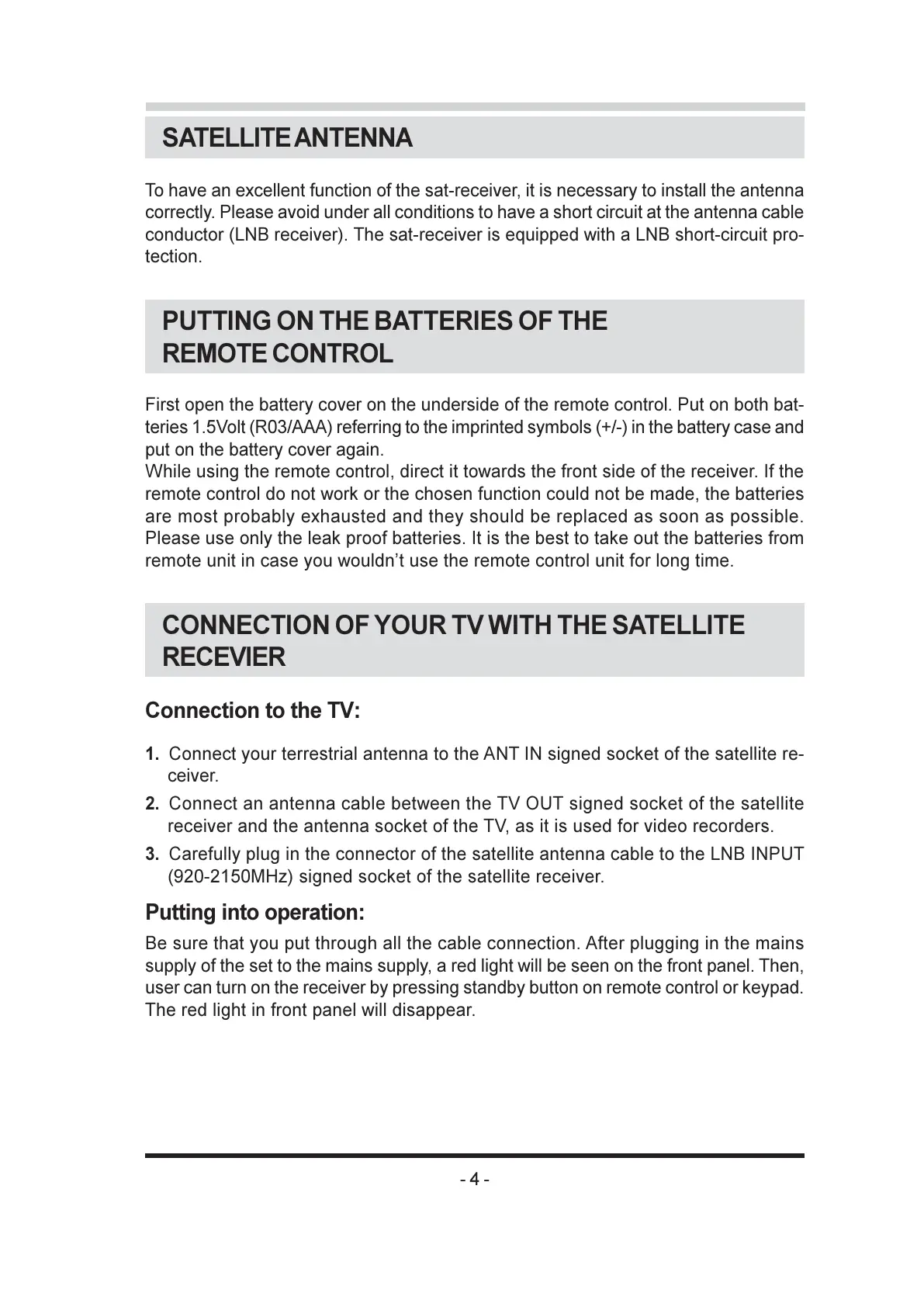 To have an excellent function of the sat-receiver, it is necessary to install the antenna