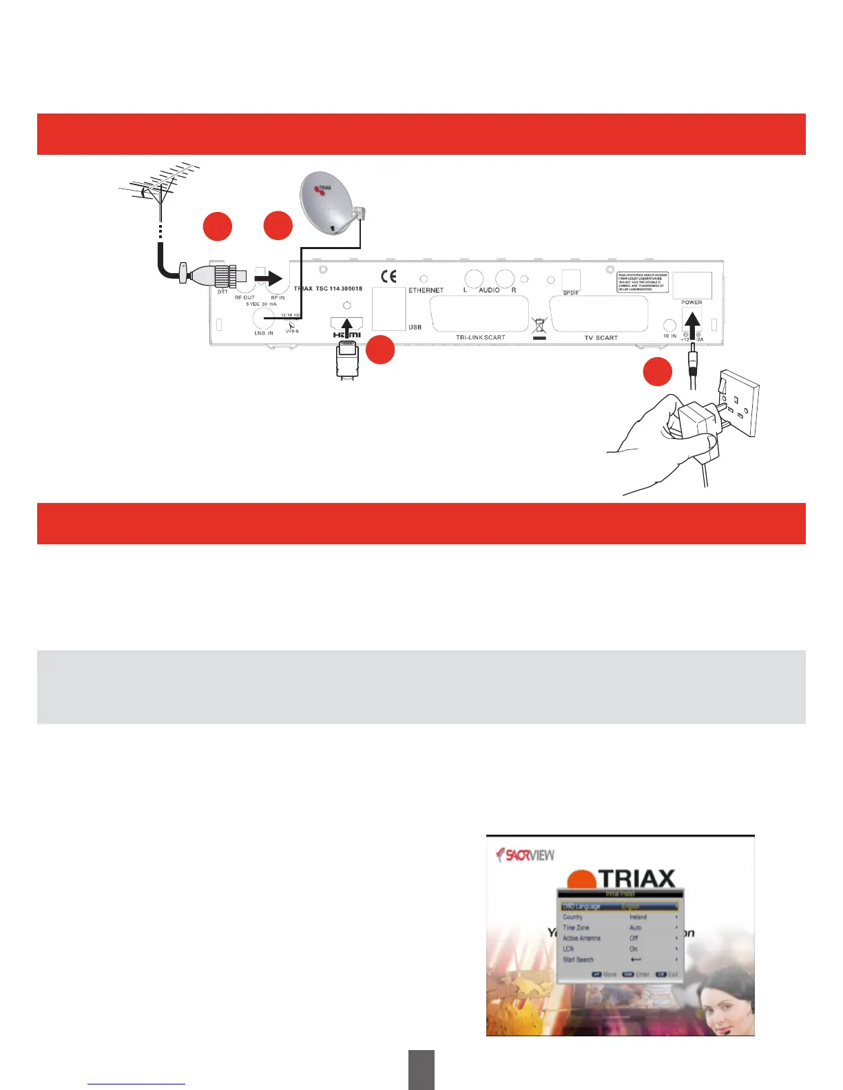 1 Ensure the aerial and satellite cables are connected before switching on.