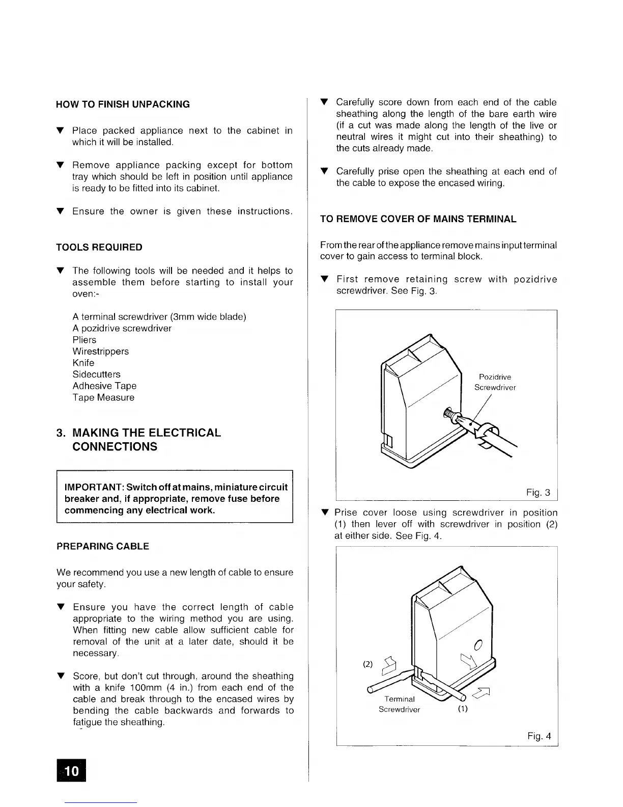 Tricity Bendix Brecon - Making the Electrical Connections; How to Finish Unpacking; Tools Required; To Remove Cover of Mains Terminal