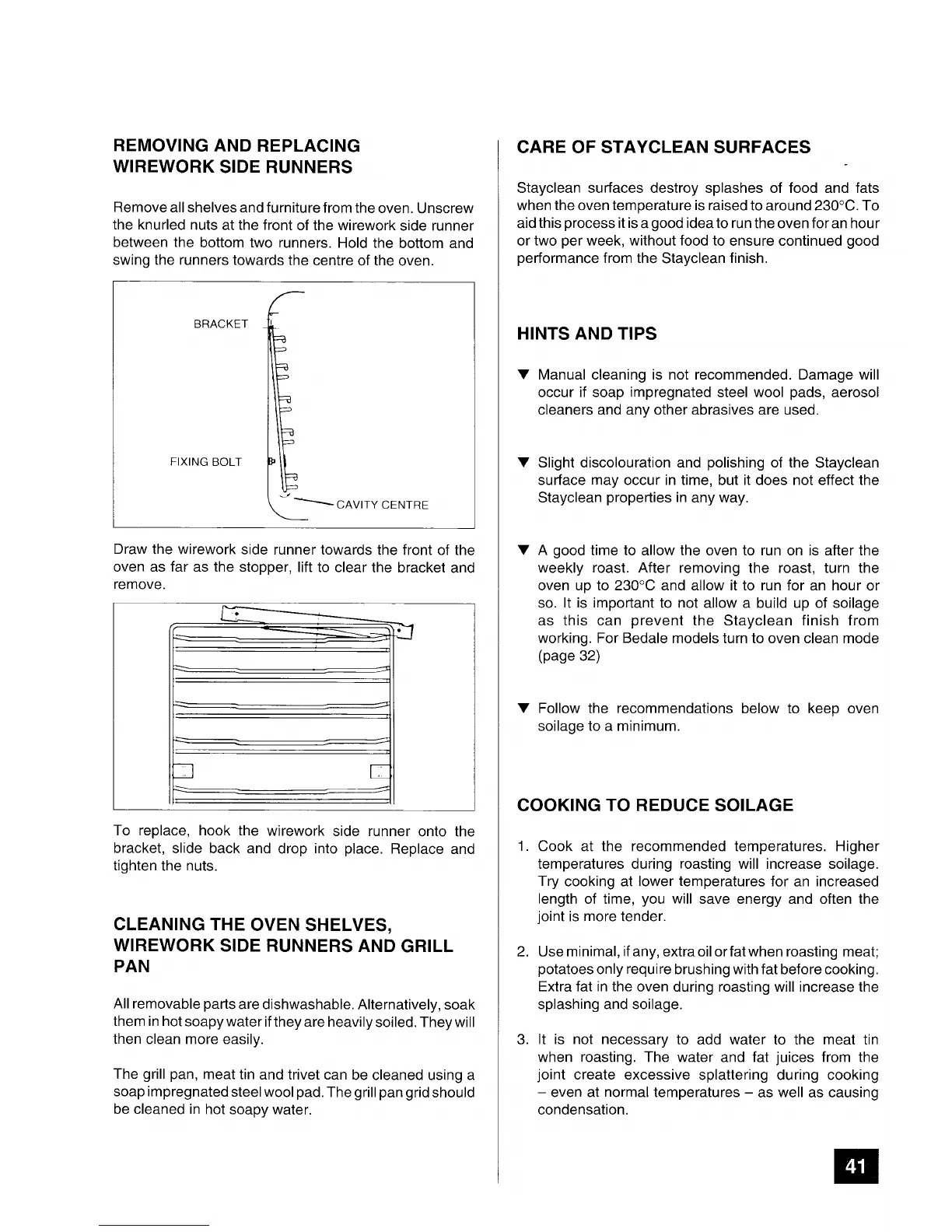 Tricity Bendix Brecon - Removing and Replacing Wirework Side Runners; Care of Stayclean Surfaces; Cooking to Reduce Soilage