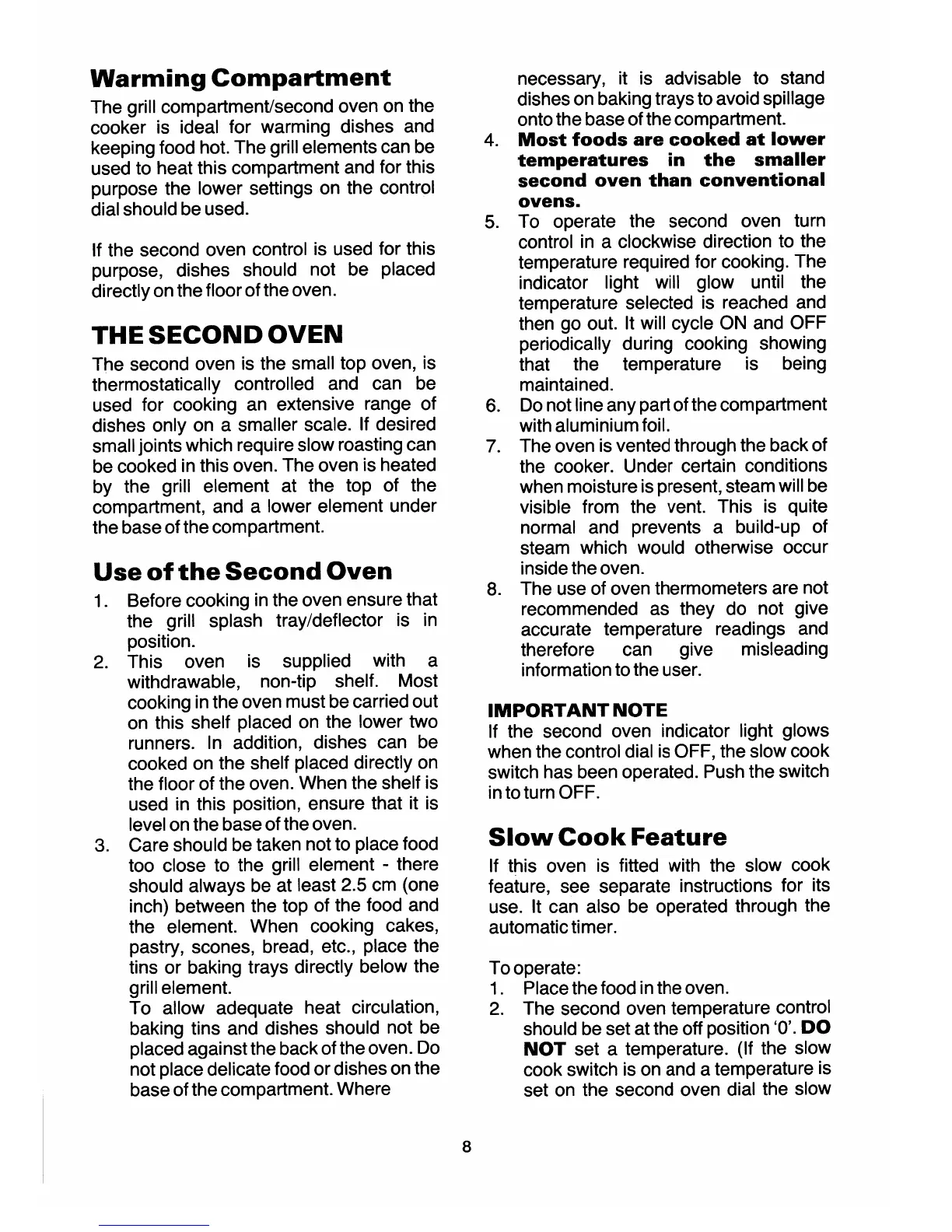Tricity Bendix Electric Cooker - Oven Compartments and Features; Warming Compartment; The Second Oven