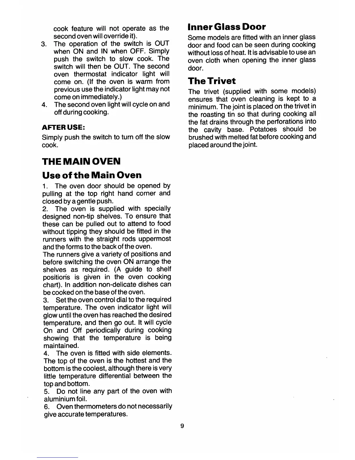 Tricity Bendix Electric Cooker - Main Oven Usage and Accessories; Main Oven Operation; Inner Glass Door and Trivet
