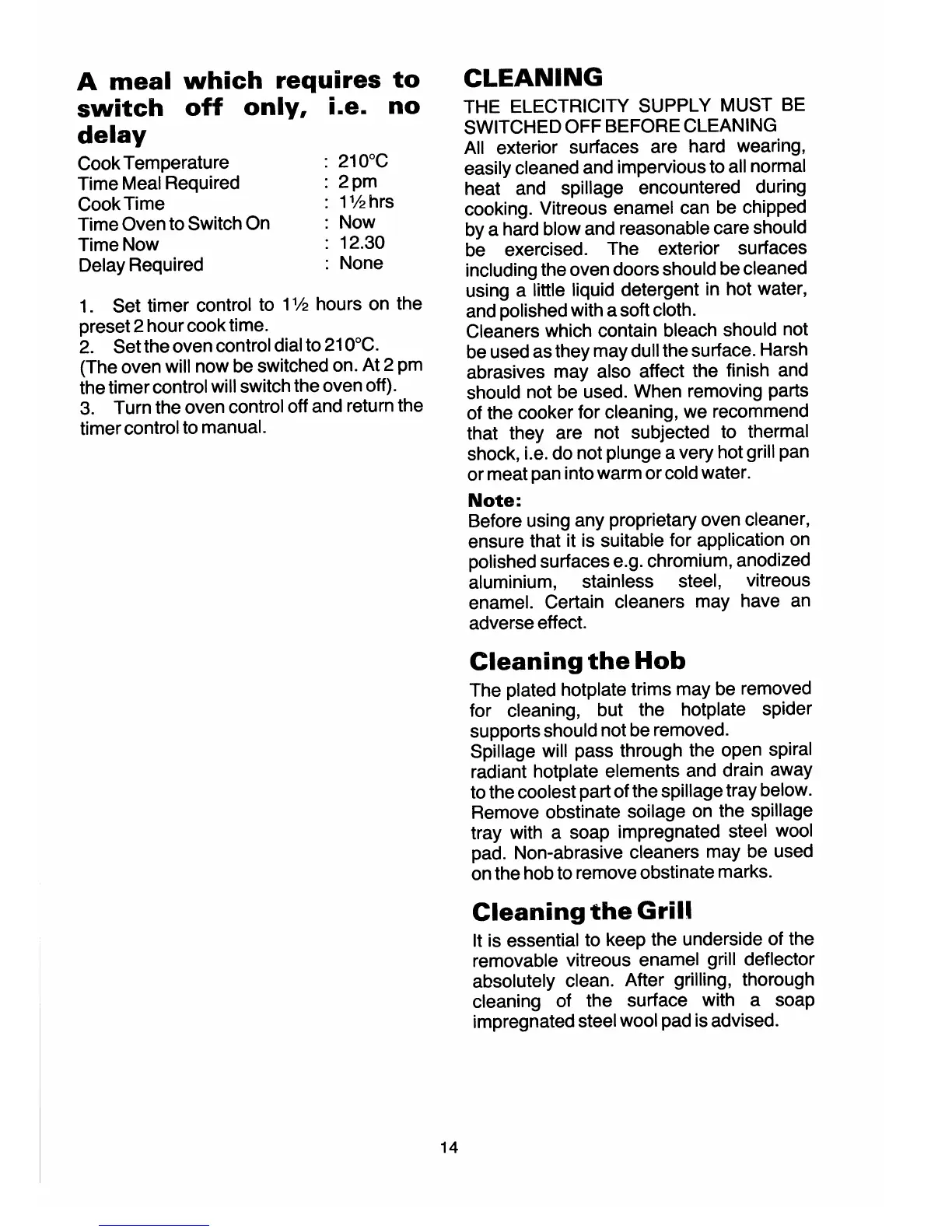 Tricity Bendix Electric Cooker - Cleaning the Cooker Components; Cleaning the Hob Surface; Cleaning the Grill Area