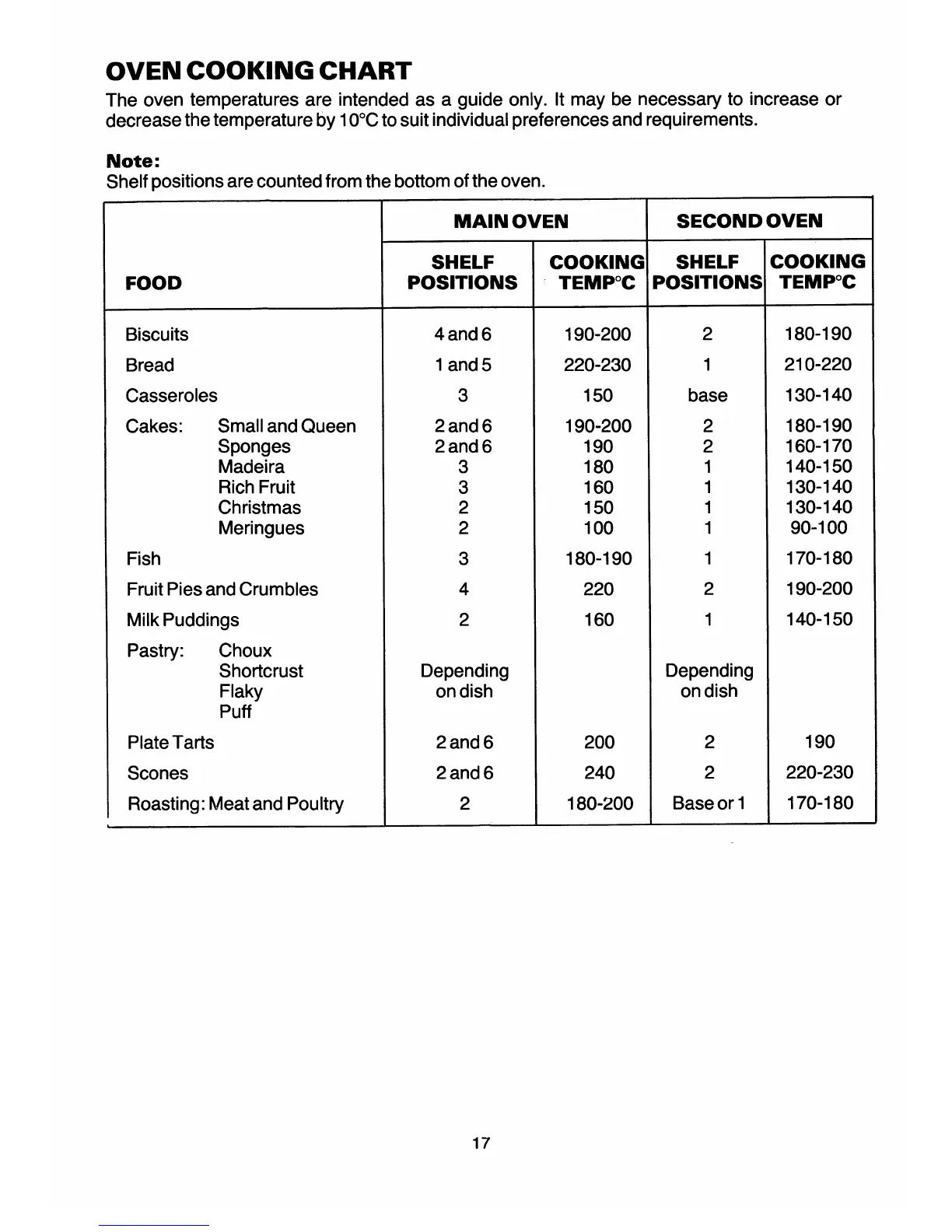 Tricity Bendix Electric Cooker - Oven Cooking Temperature Guide