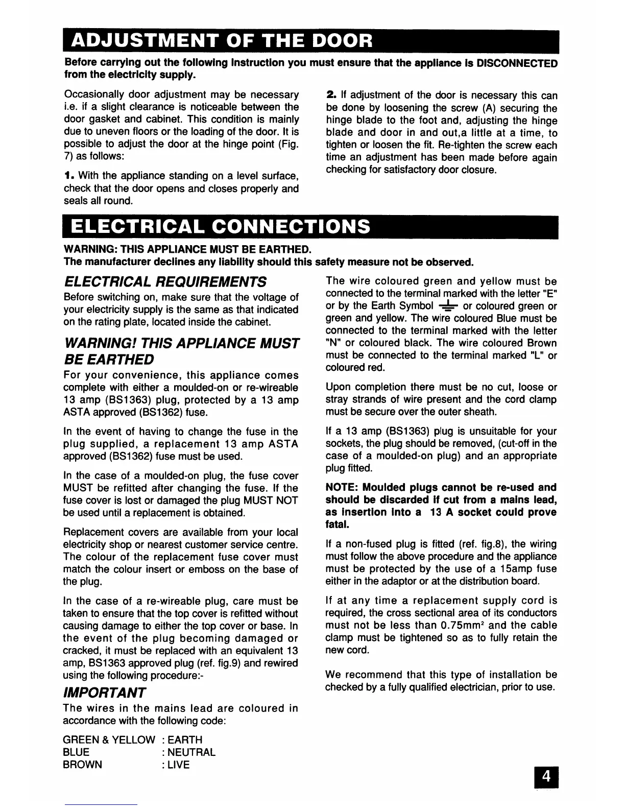 Tricity Bendix Freezer - ADJUSTMENT OF THE DOOR; ELECTRICAL CONNECTIONS