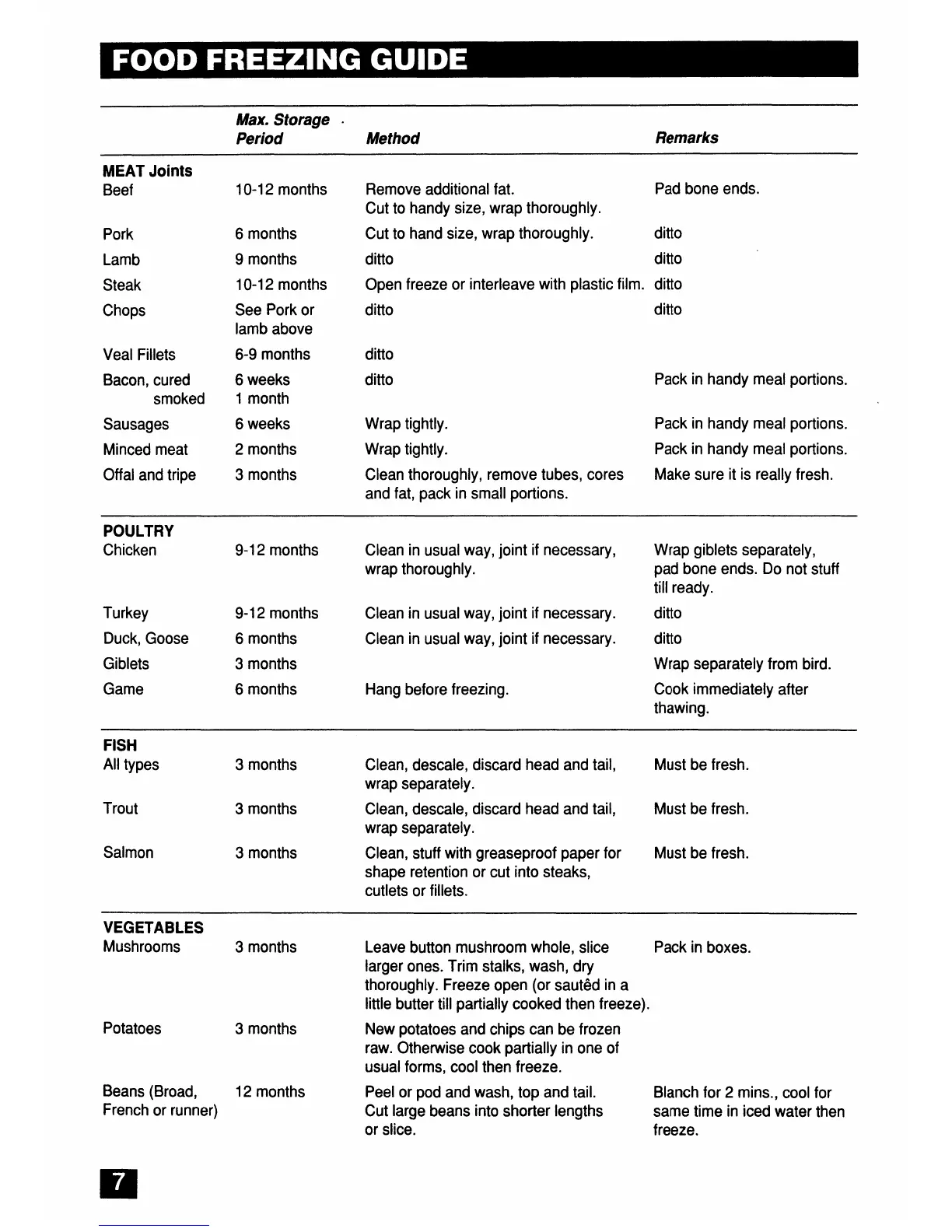Tricity Bendix Freezer - FOOD FREEZING GUIDE