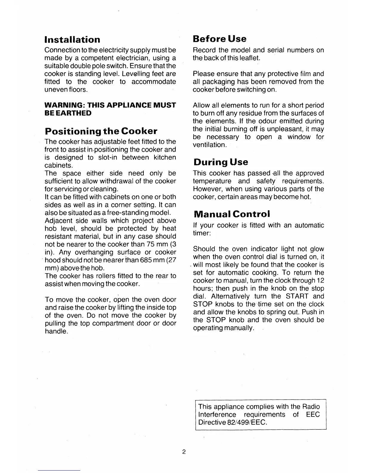 Tricity Bendix President - Installation and Initial Setup; Before Use; Manual Control Operation; Positioning the Cooker