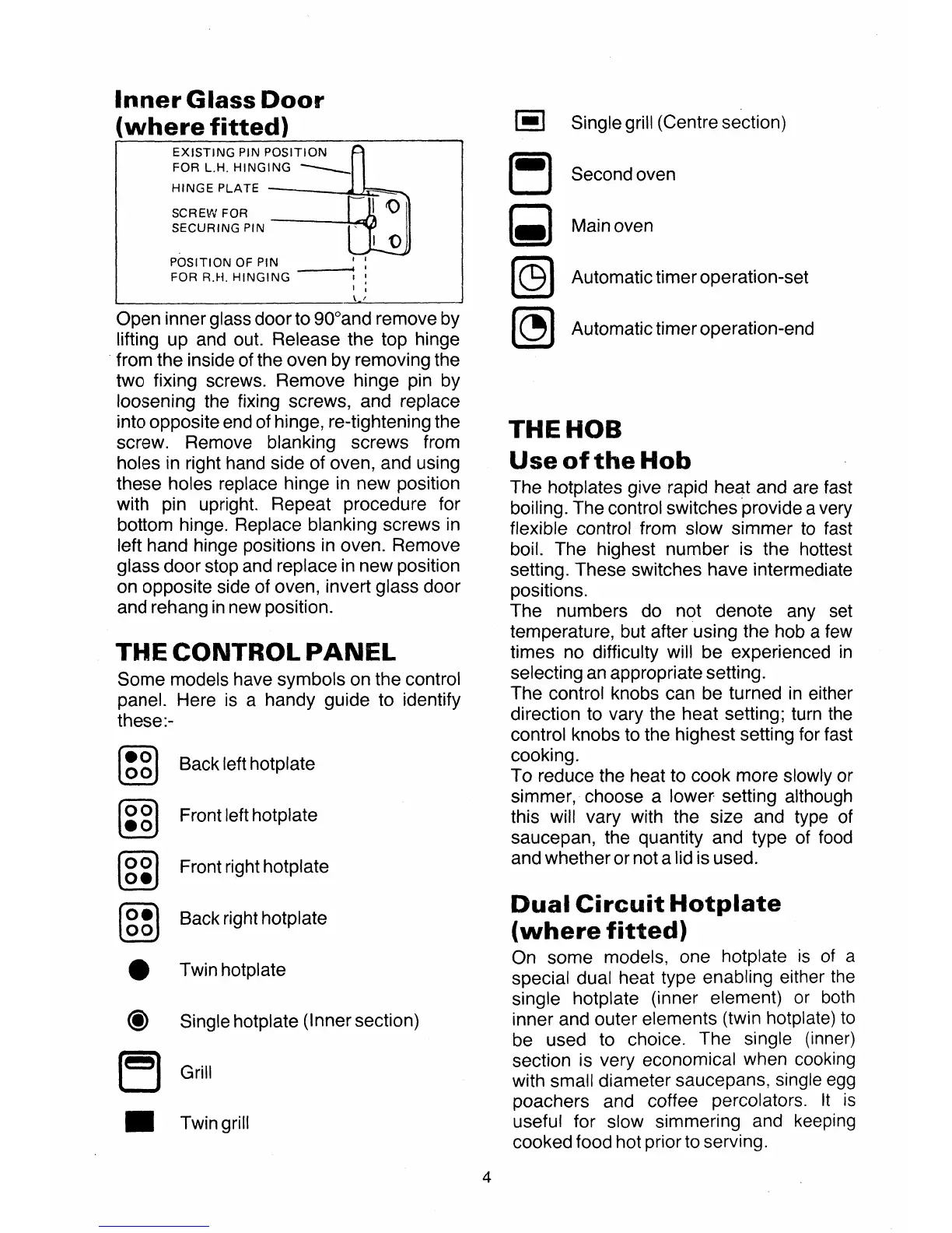 Tricity Bendix President - Inner Glass Door Features; The Control Panel Explained; Hob Operation and Features; Use of the Hob