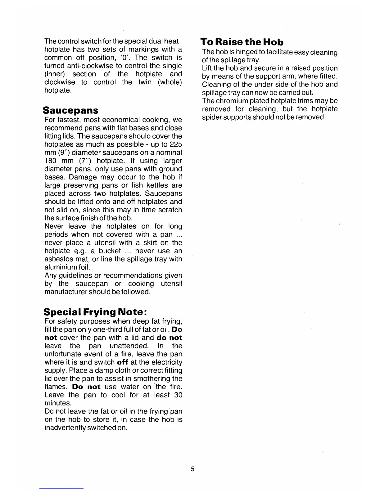 Tricity Bendix President - Saucepan Recommendations; Special Frying Safety Precautions; Hob Maintenance: Raising the Hob