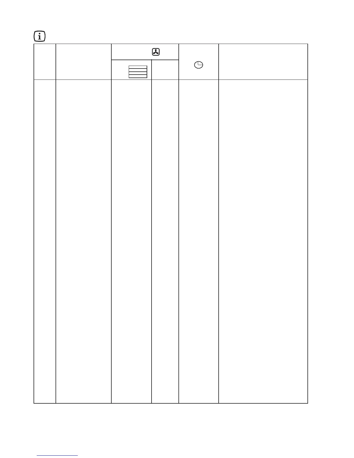 Cooking times in the tables do not include pre-heating. It is necessary to pre-heat the oven for about 10