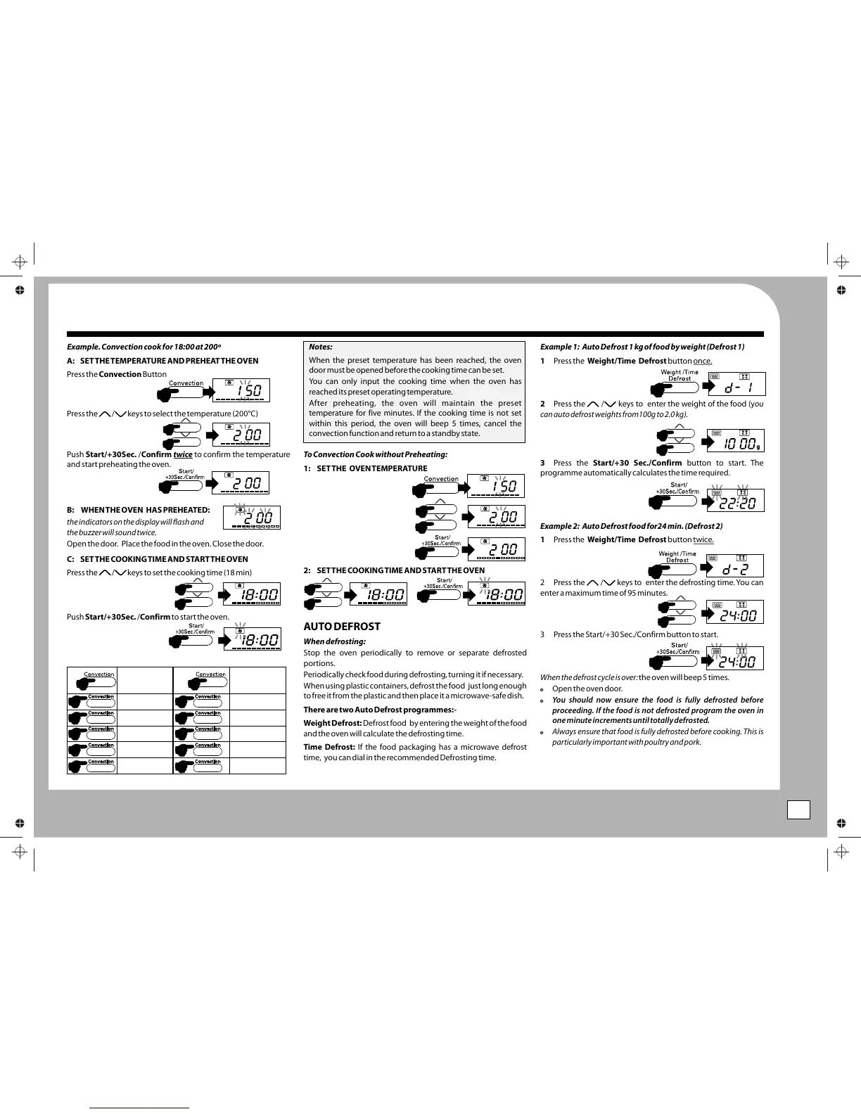 Example. Convection cook for 18:00 at 200º Notes: Example 1: Auto Defrost 1 kg of food by weight (Defrost 1)