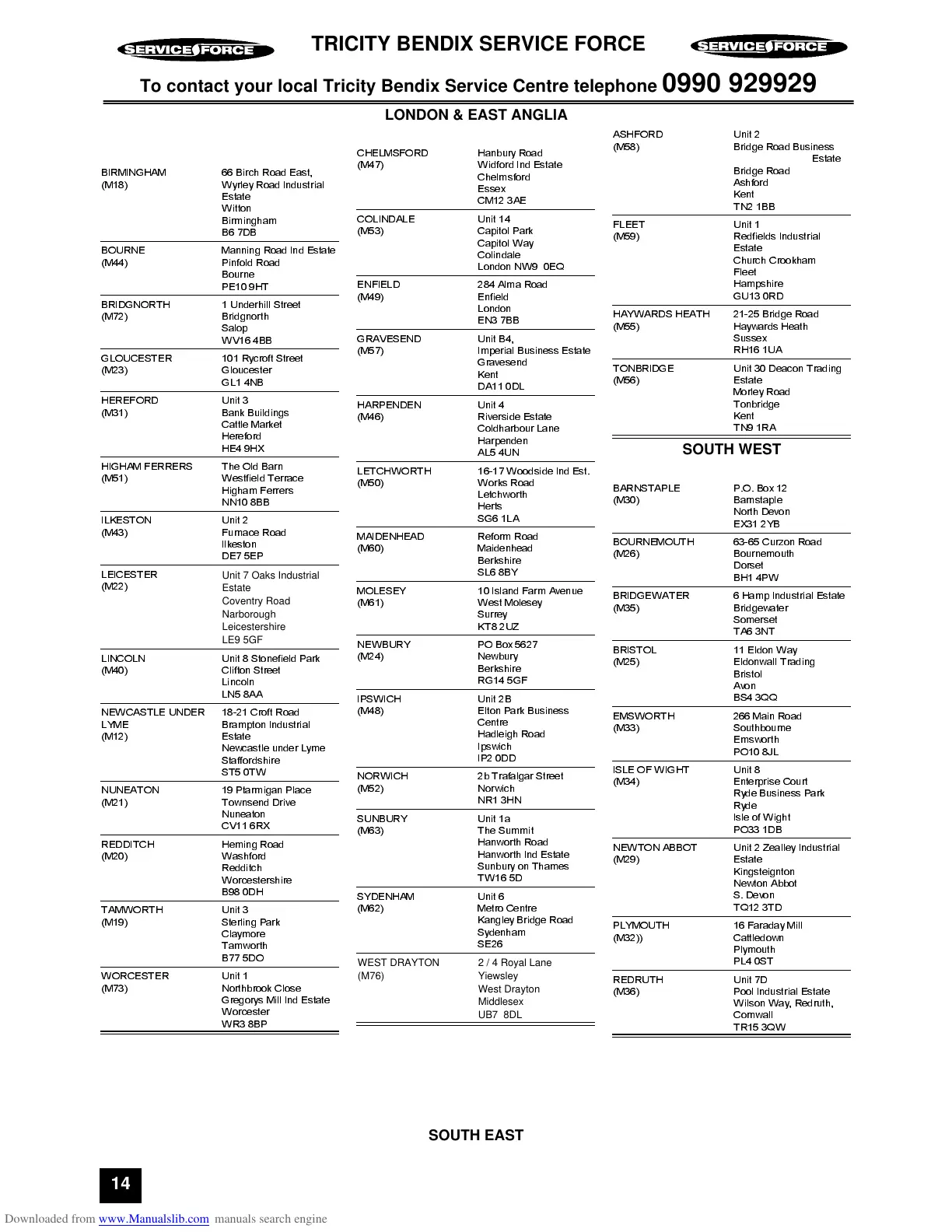 To contact your local Tricity Bendix Service Centre telephone 0990 929929
