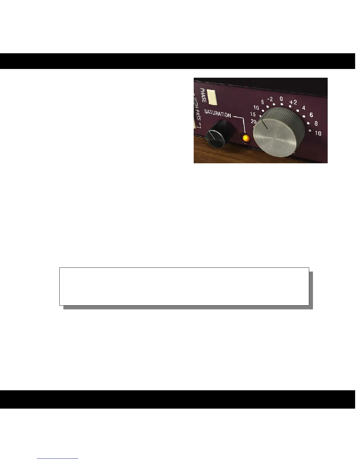 for the saturation circuits. The LED next to the saturation knob indicates when the signal is
