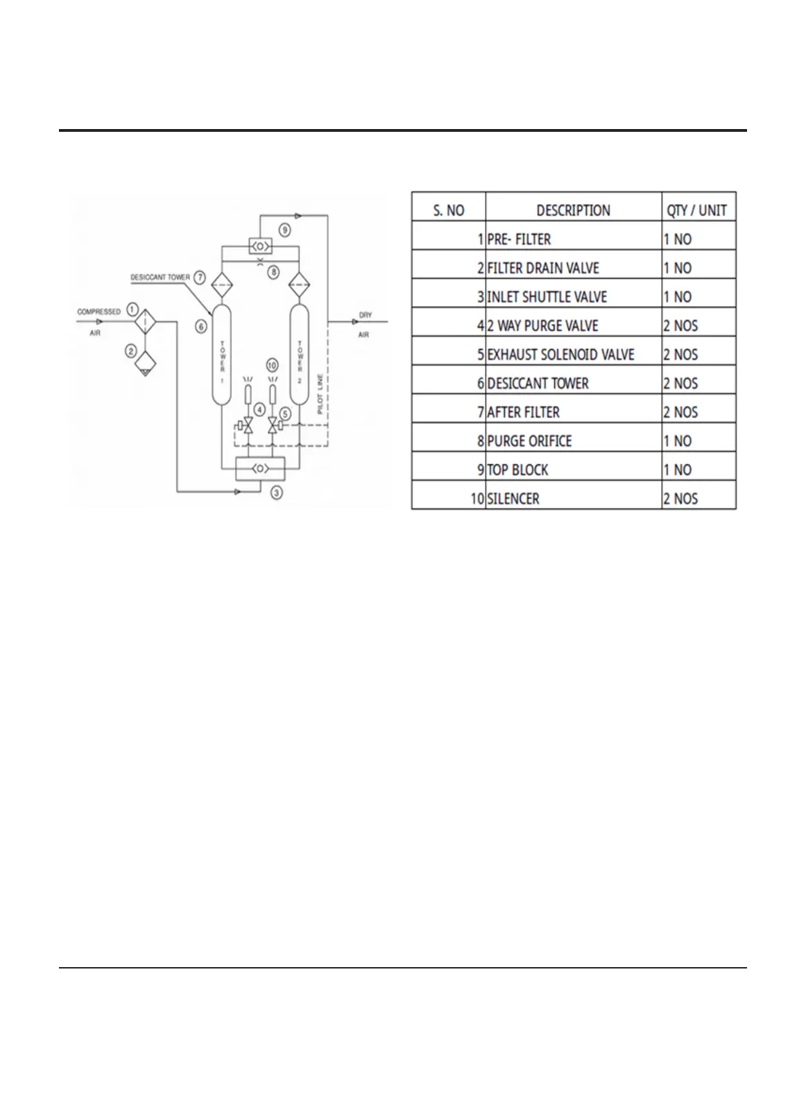 filter. The air then flows through the inlet shuttle valve, which diverts it to tower 1. The desiccant in tower 1 dries the
