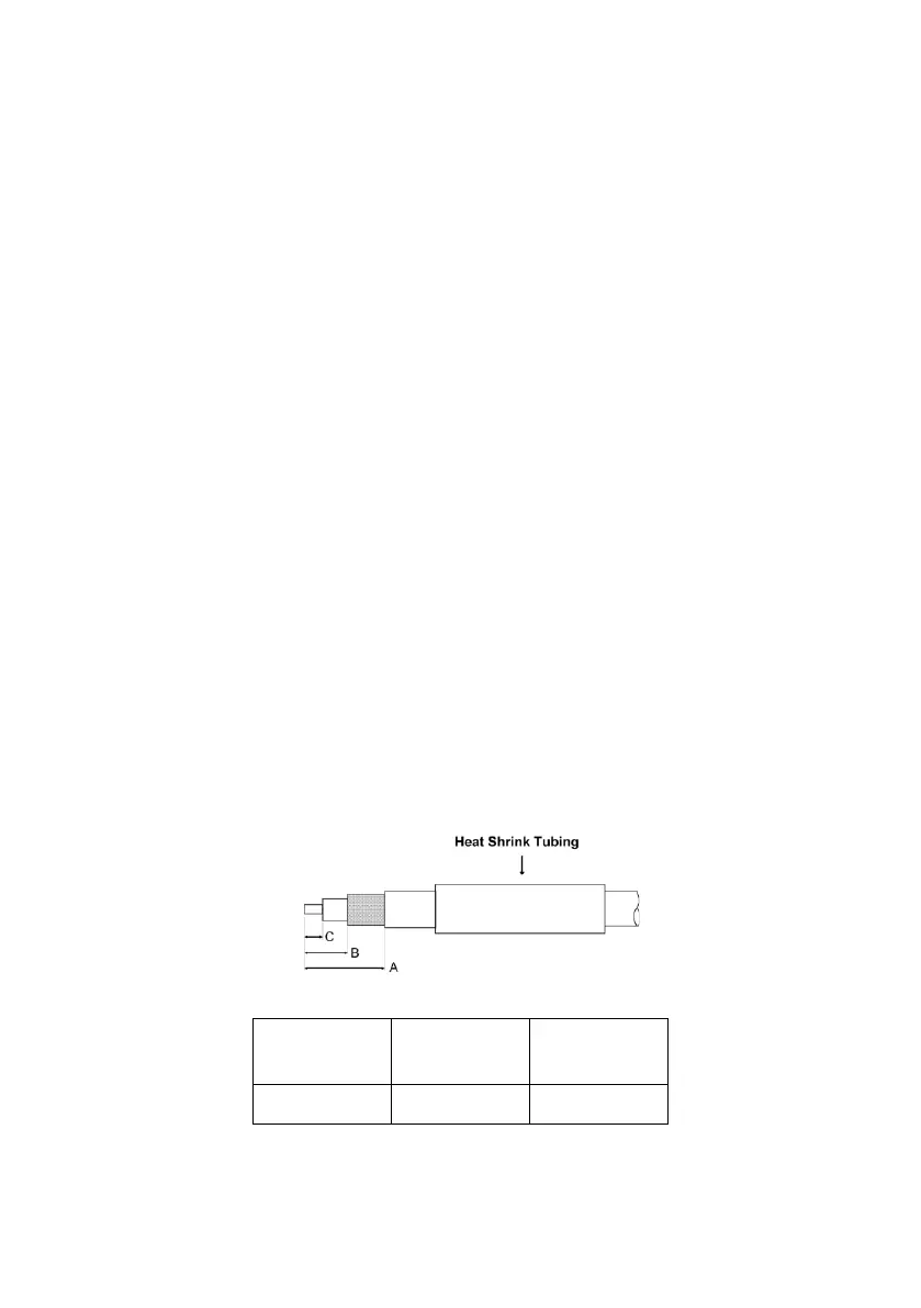 Strip back the coax cable to the dimensions in the table, as shown in