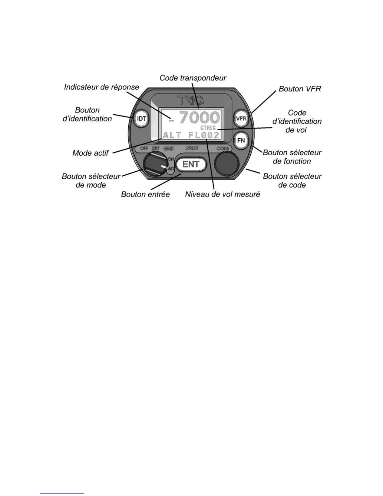 L’écran affiche le mode de fonctionnement du transpondeur, l’altitude-