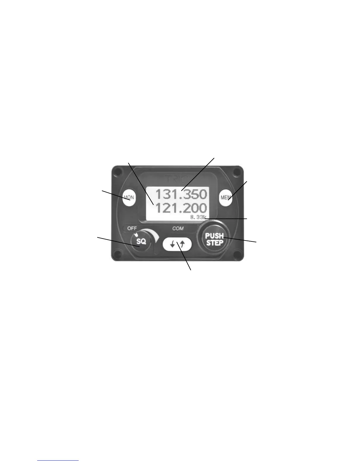 The display shows the active and standby frequencies for the radio, and has