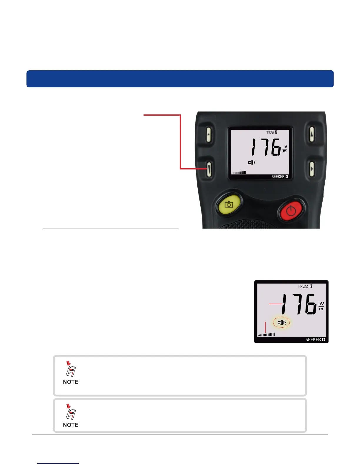 To check the volume level, turn your Seeker D on and press the VOLUME button once.