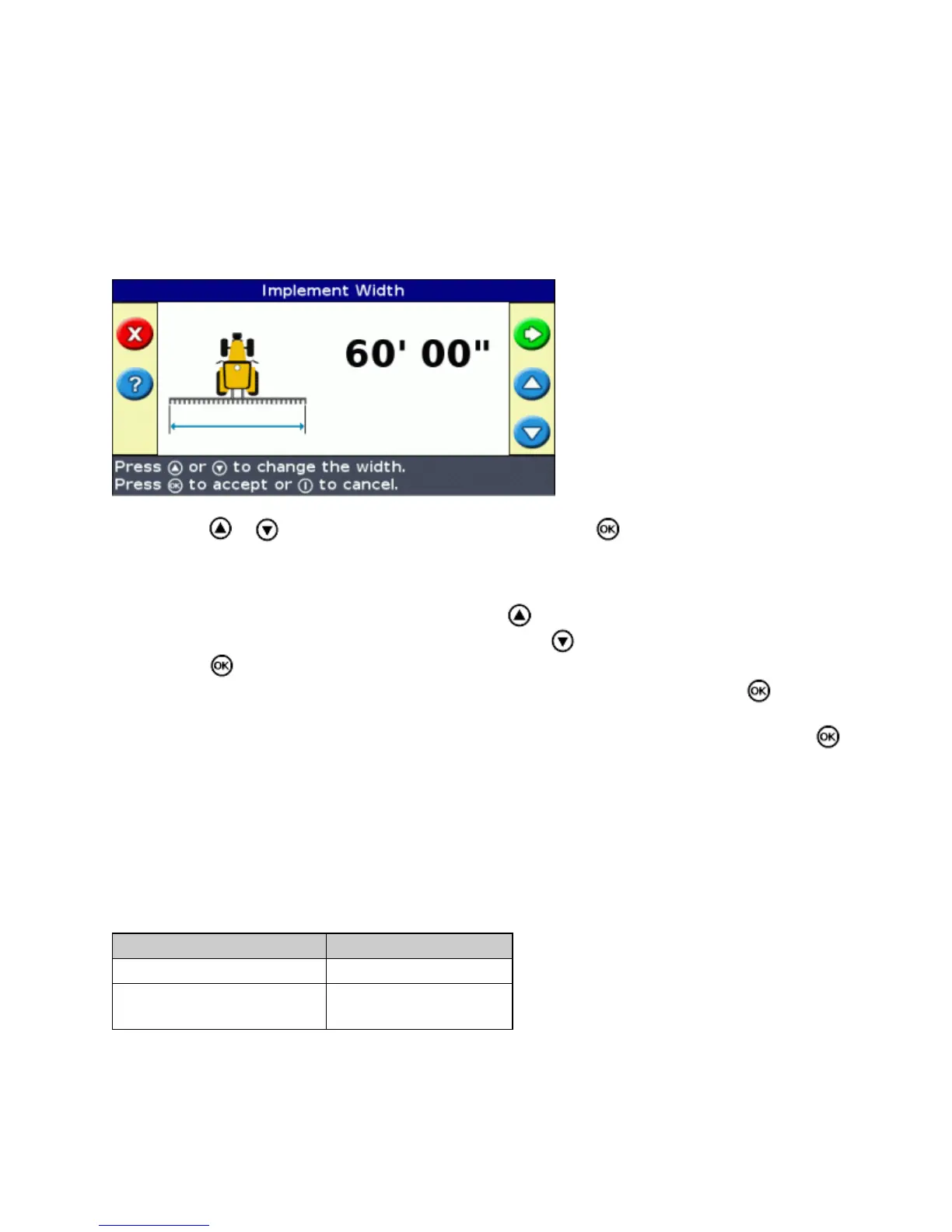 Press or to adjust the implement width and then press . The Overlap/Skip screen appears.1.