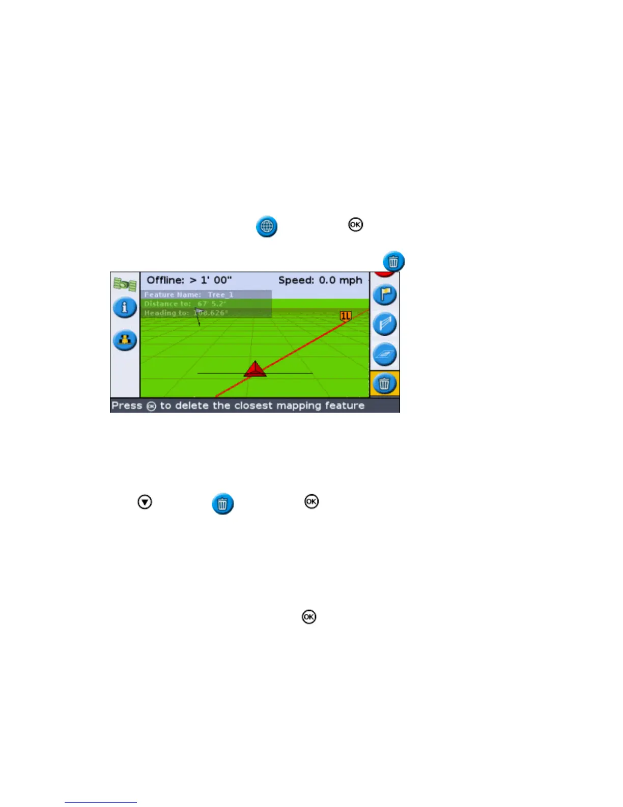 Drive towards the feature you want to delete, until it is selected as the closest feature. The closest feature