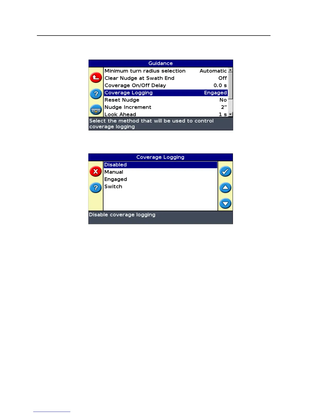 5. Select Coverage Logging and then press . The Coverage Logging screen