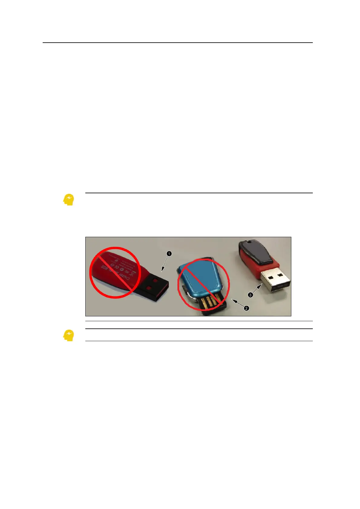 ATTENTION — Only use a USB flash drive with a metal surround on the connector (1),