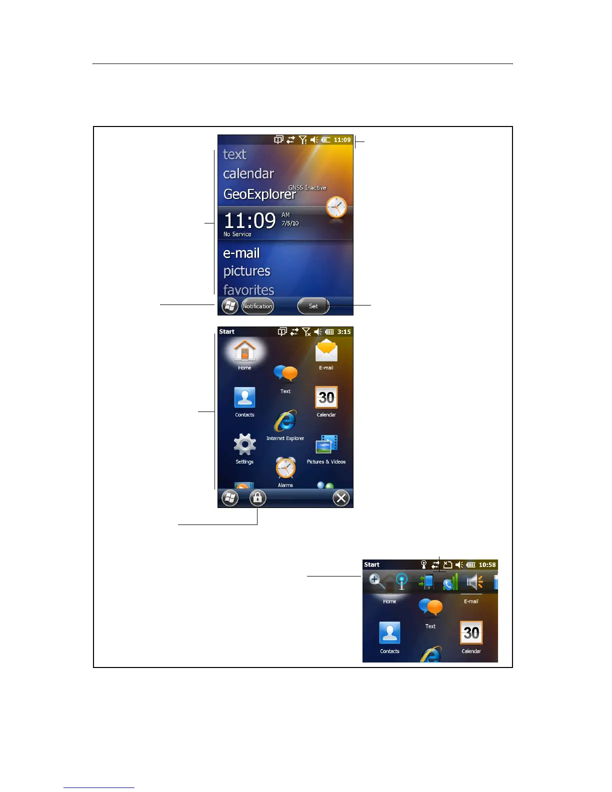 The main parts of the Home screen and the Start screen are shown below.