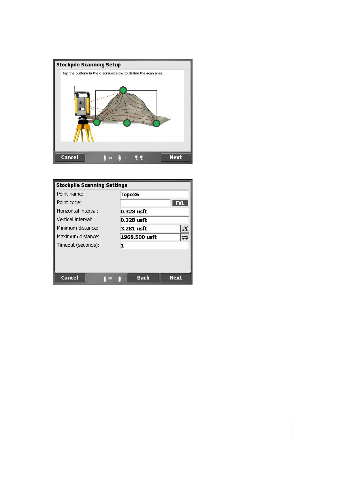 Tap Next. The Stockpile Scanning Settings dialog appears: