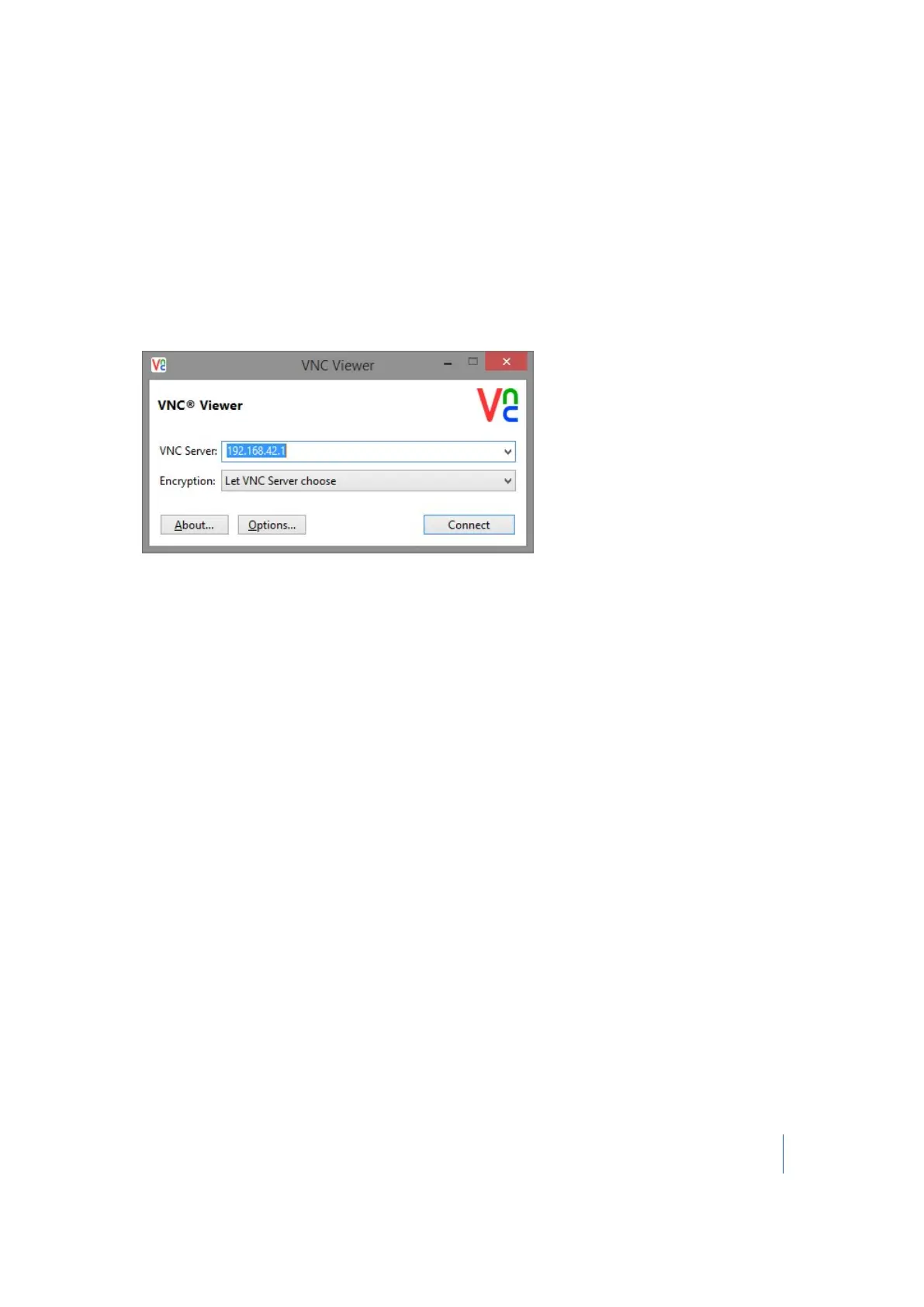 Configure the VNC Server with the IP address of 192.168.42.1 as shown and then click Connect: