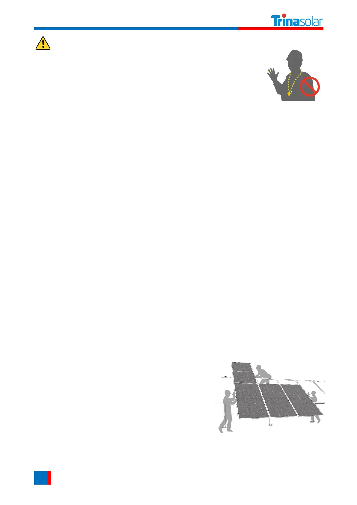 Do not stand on the module glass while working. There is a risk of injury or electric shock if the glass