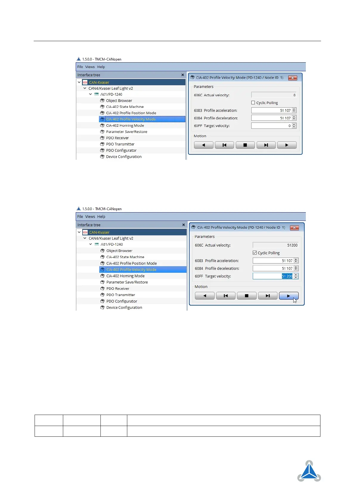 3. Input the motor target velocity (0x60FF) of 51200 (equals 1rps) and click on the play button. The