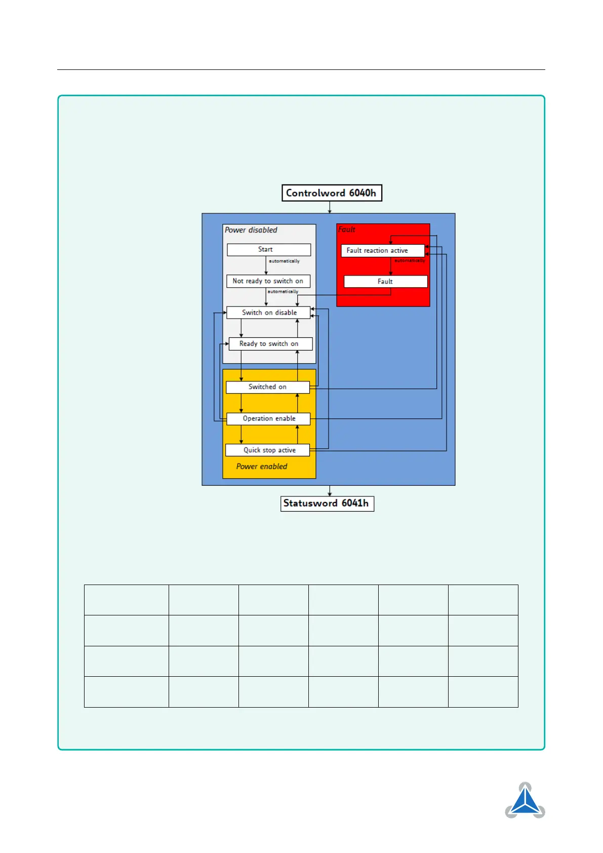 the object 0x6040 (Controlword). The state of the state machine can be read by the object 0x6041