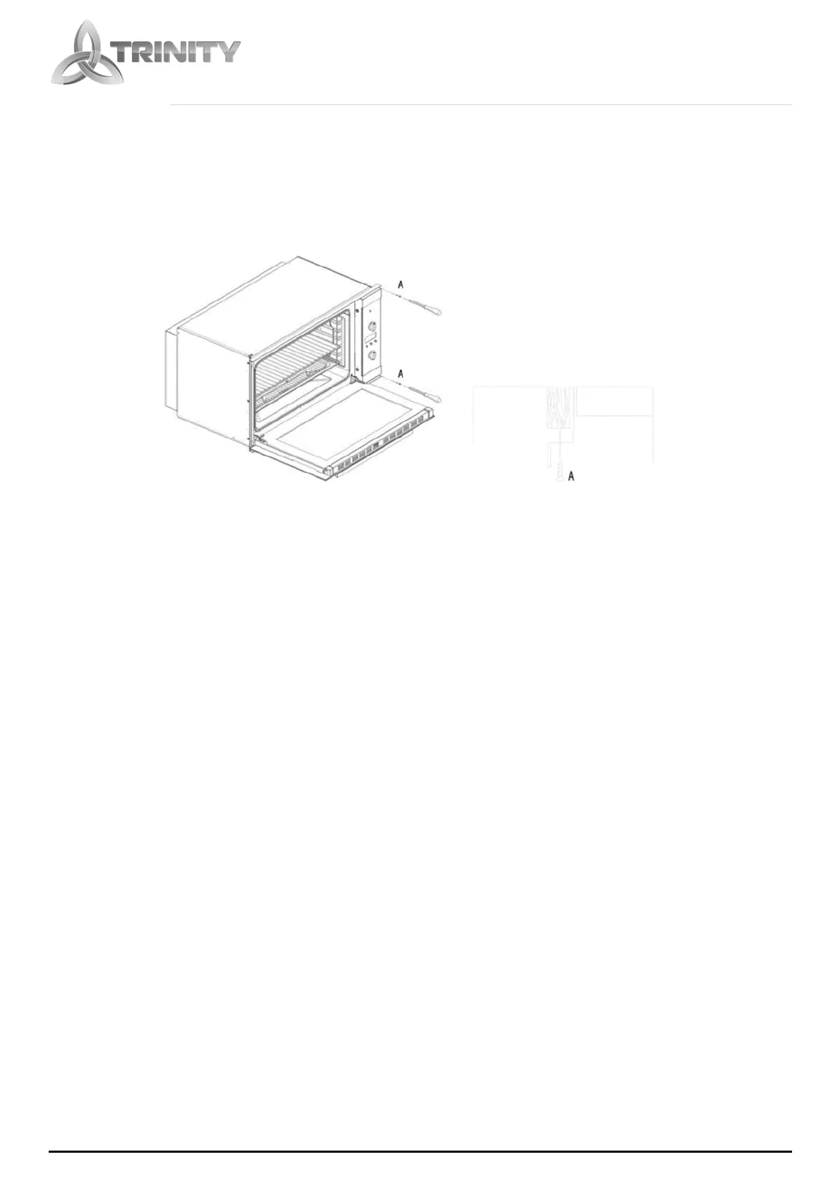 Open the oven door and fasten the oven to the cabinet using four screws “A” as