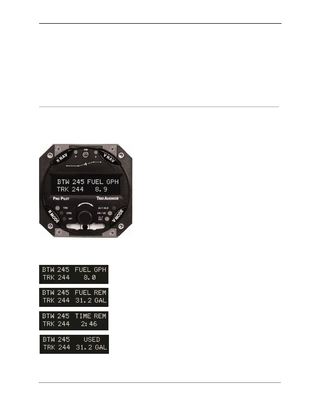 The fuel management option for the Pro Pilot allows the pilot to view multiple fuel parameters. It