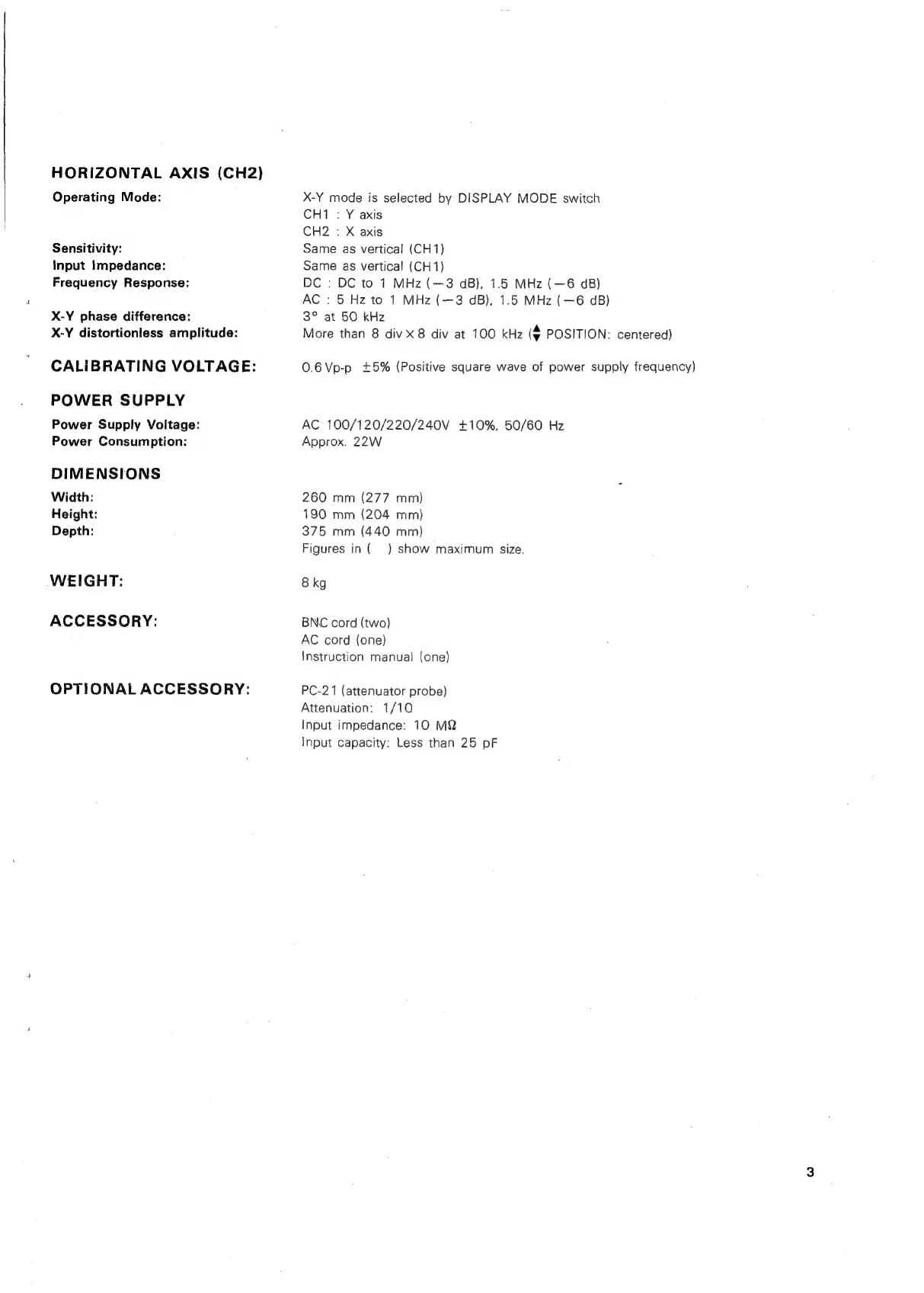 Trio CS-1575 - HORIZONTAL AXIS, CALIBRATING VOLTAGE, AND POWER SUPPLY SPECIFICATIONS; DIMENSIONS, WEIGHT, AND ACCESSORIES