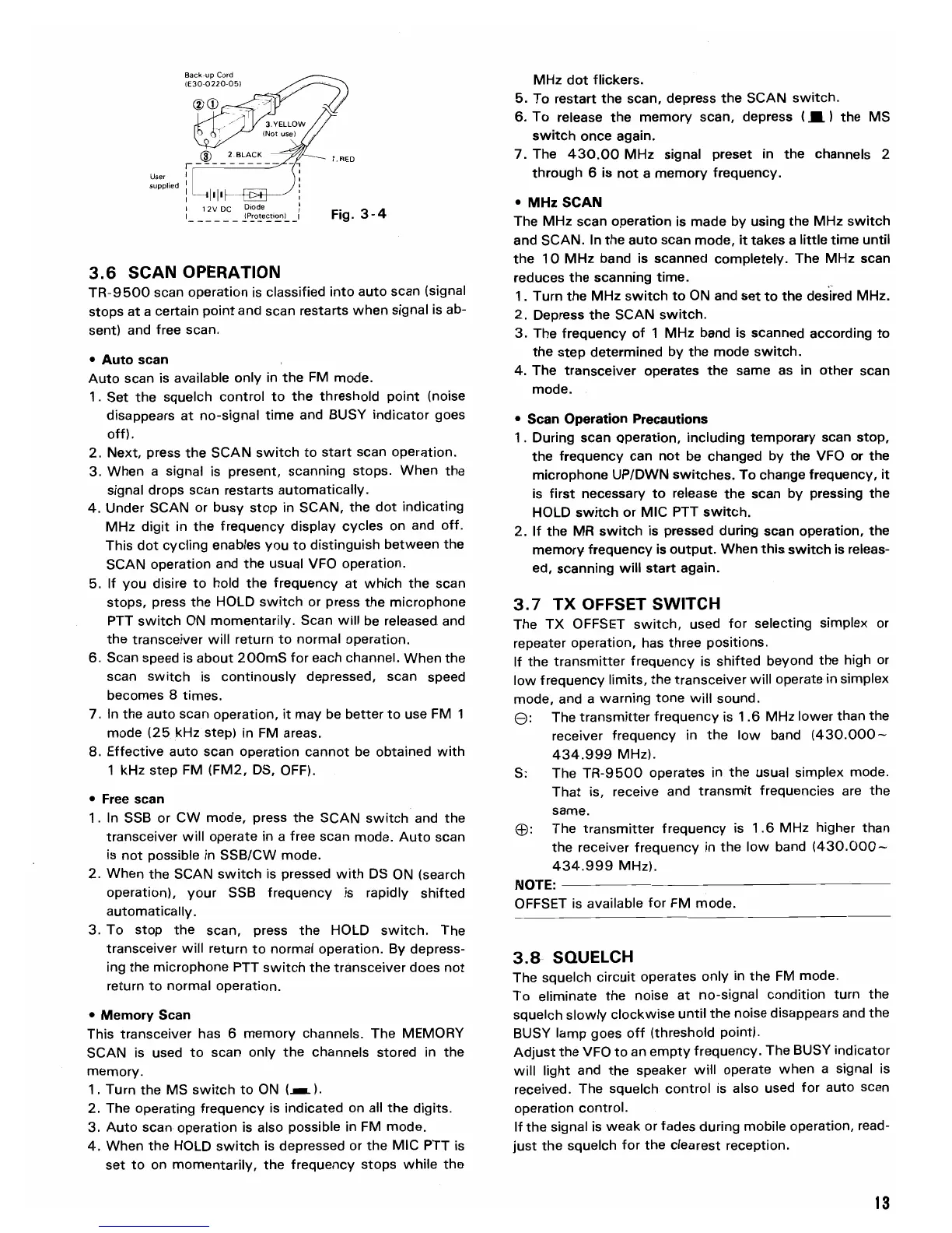 Trio TR- - 3.6 Scan Operation; 3.7 TX Offset Switch; 3.8 Squelch