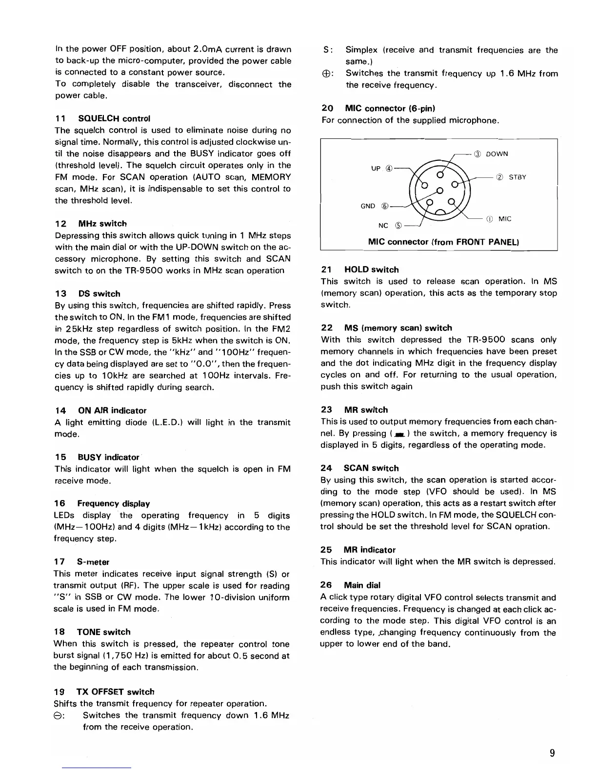 Trio TR- - Squelch, MHz, and DS Switches; Scan and Memory Operation Controls