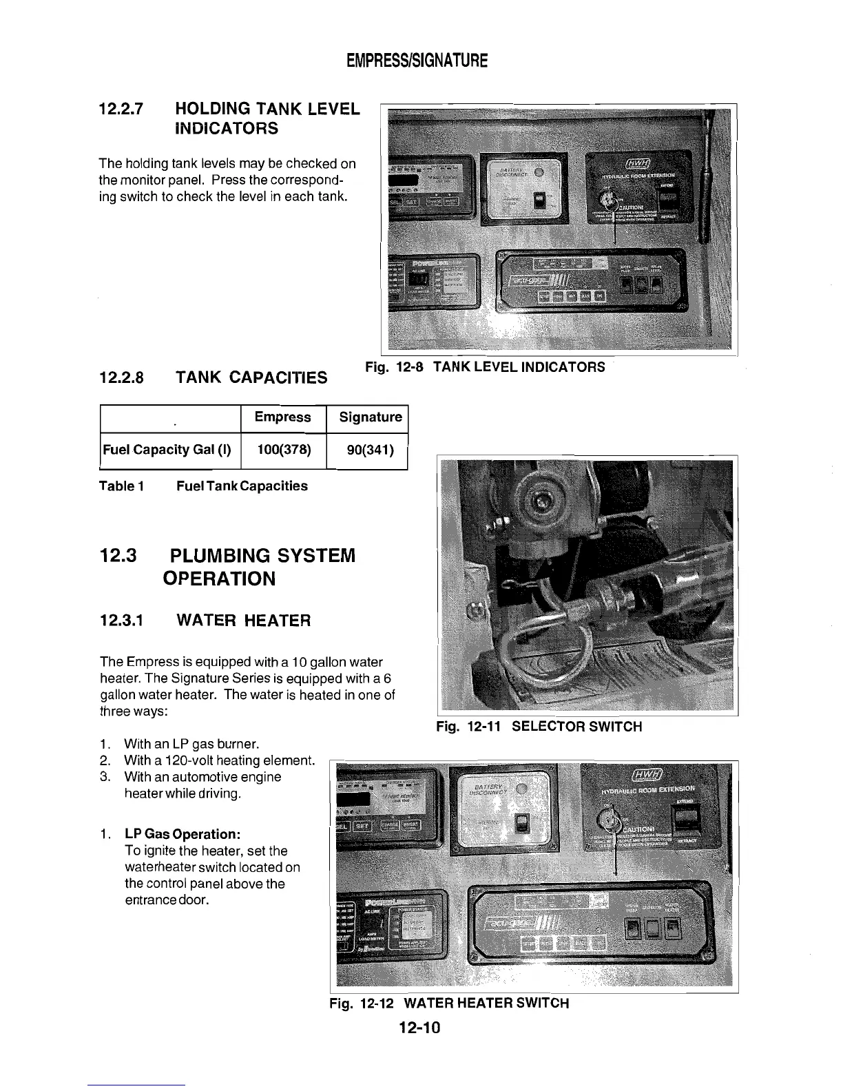 Triple E 2001 Empress series - Plumbing System Operation; Holding Tank Level Indicators; Tank Capacities; Selector Switch View