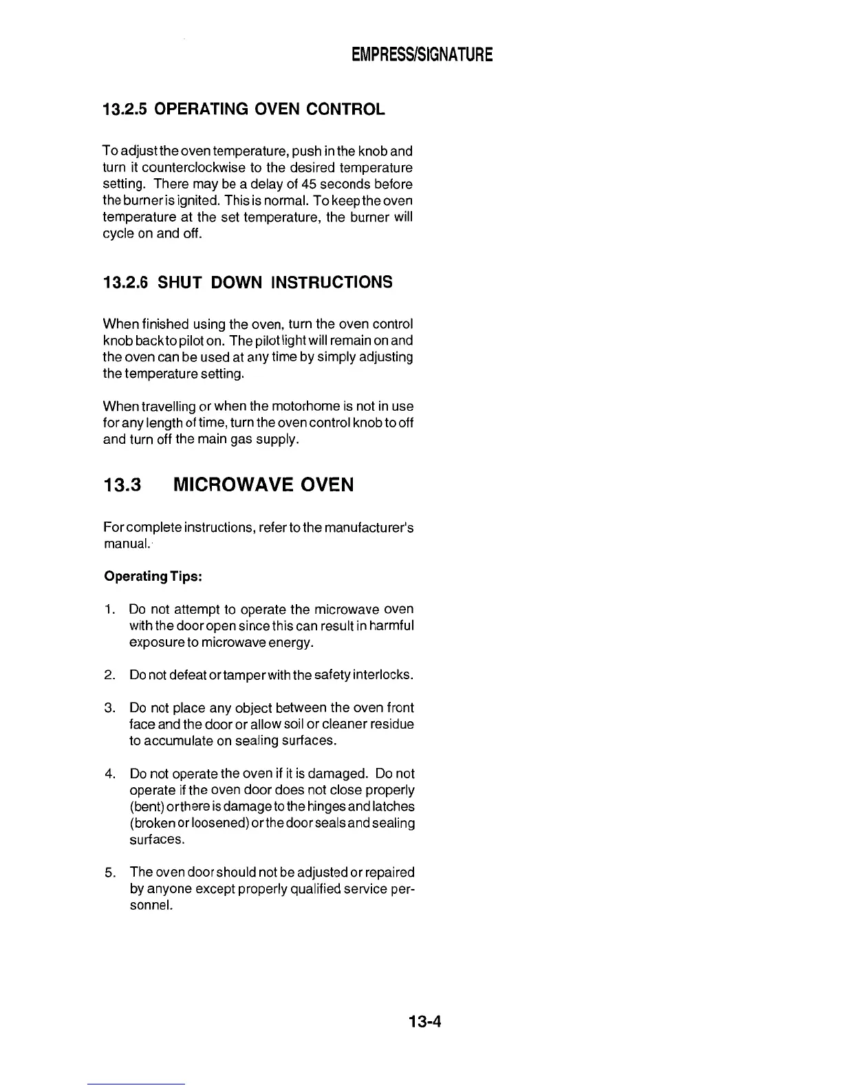 Triple E 2001 Empress series - Microwave Oven; Operating Oven Control; Shut down Instructions