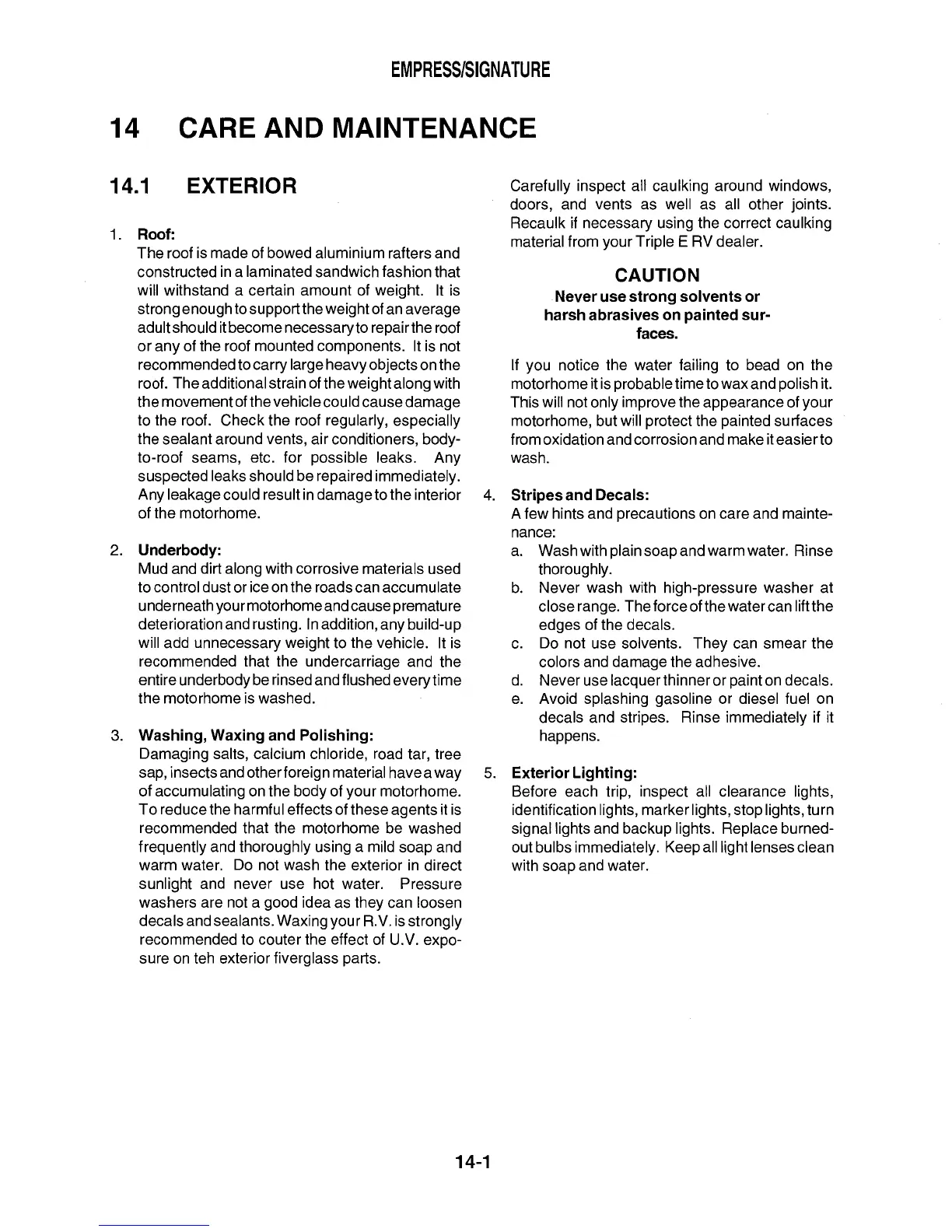 Triple E 2001 Empress series - Care and Maintenance; Exterior Cleaning; Washing, Waxing and Polishing; Stripes and Decals