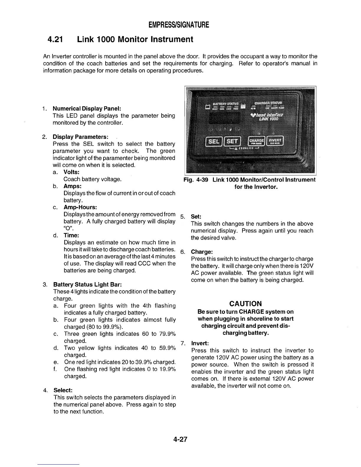 Triple E 2001 Empress series - Link 1000 Monitor Instrument; Display Parameters; Battery Status Light Bar; Charge