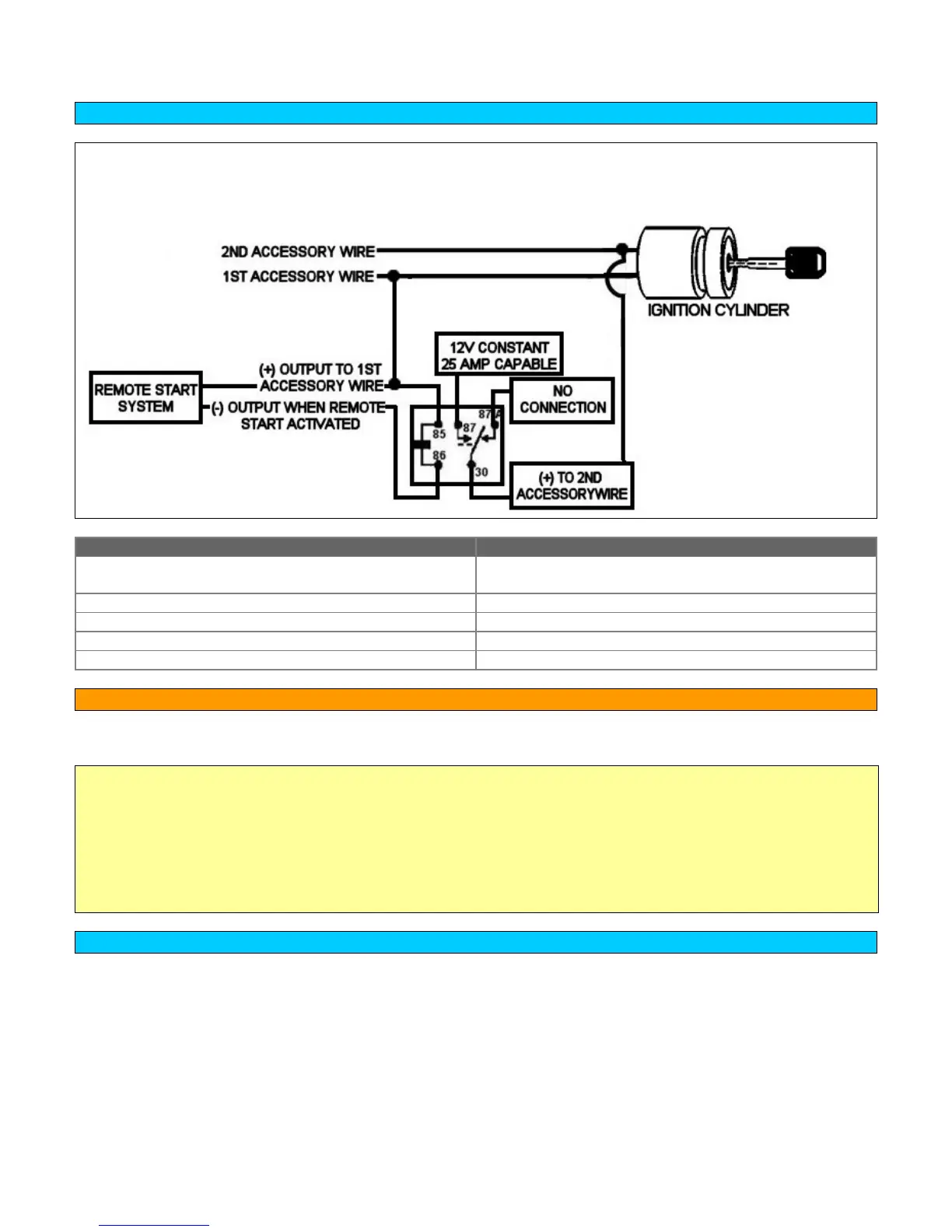 NEVER connect two Accessory wires of the vehicle together to avoid using a relay. If the vehicle