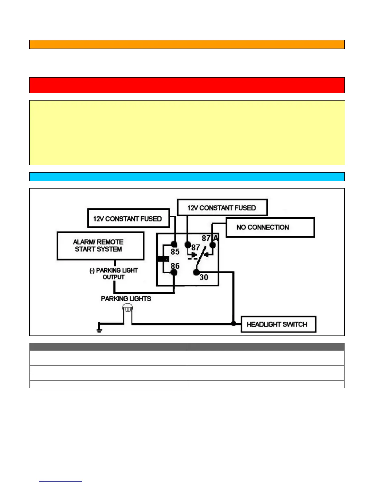 NOTE: Never connect the parking light output to the headlight circuit. Doing so may cause the headlights