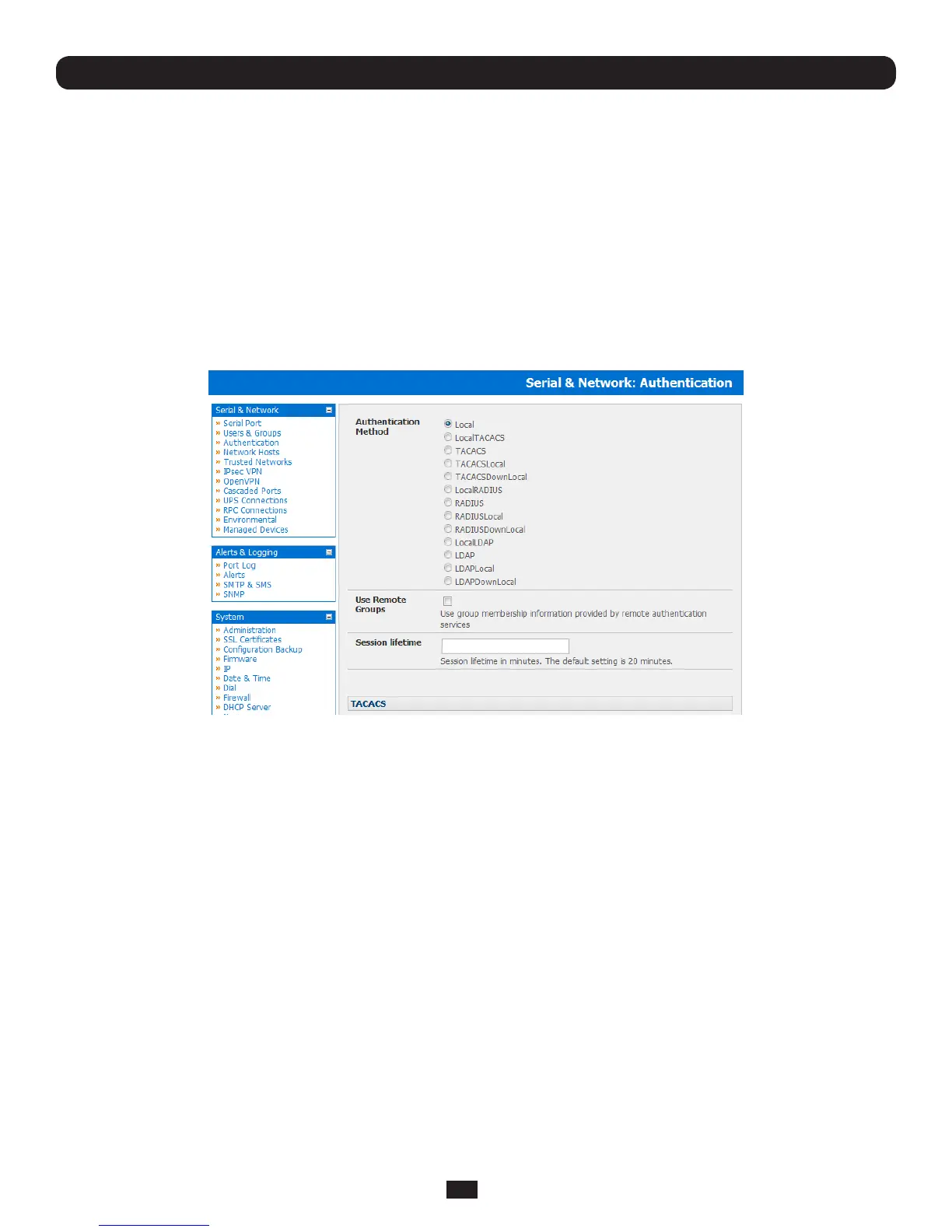 TheConsoleServercanbeconguredtothedefault(Local)oranalternateauthenticationmethod(TACACS, RADIUS